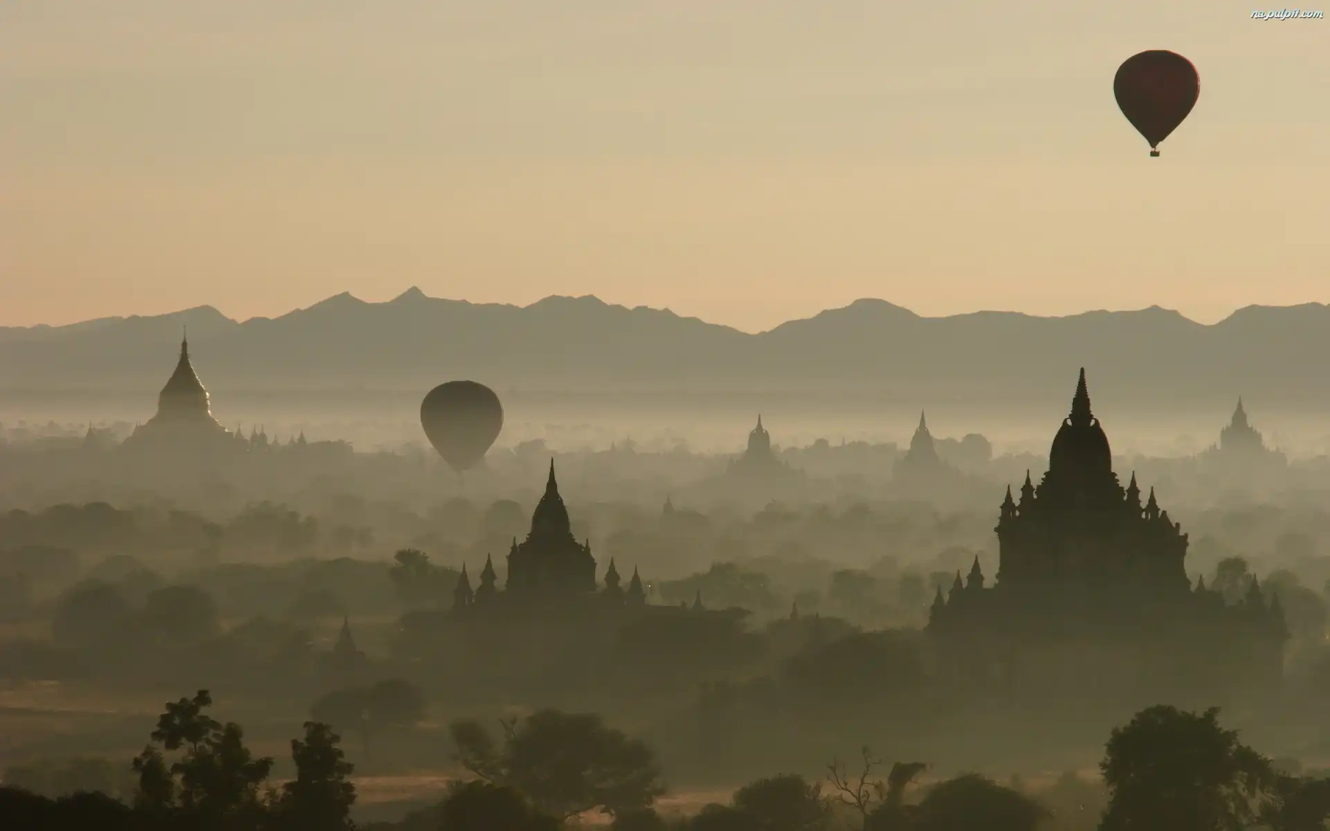 Drzewa, Mgła, Budynki, Balony Na Pulpit