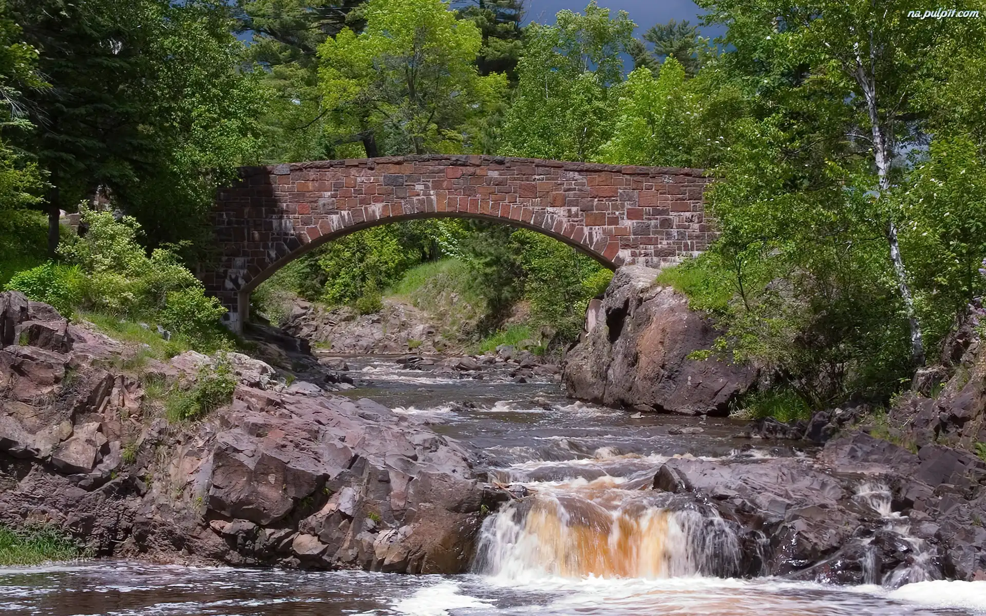 Drzewa, Rzeczka, Most, Ceglany, Kamienie