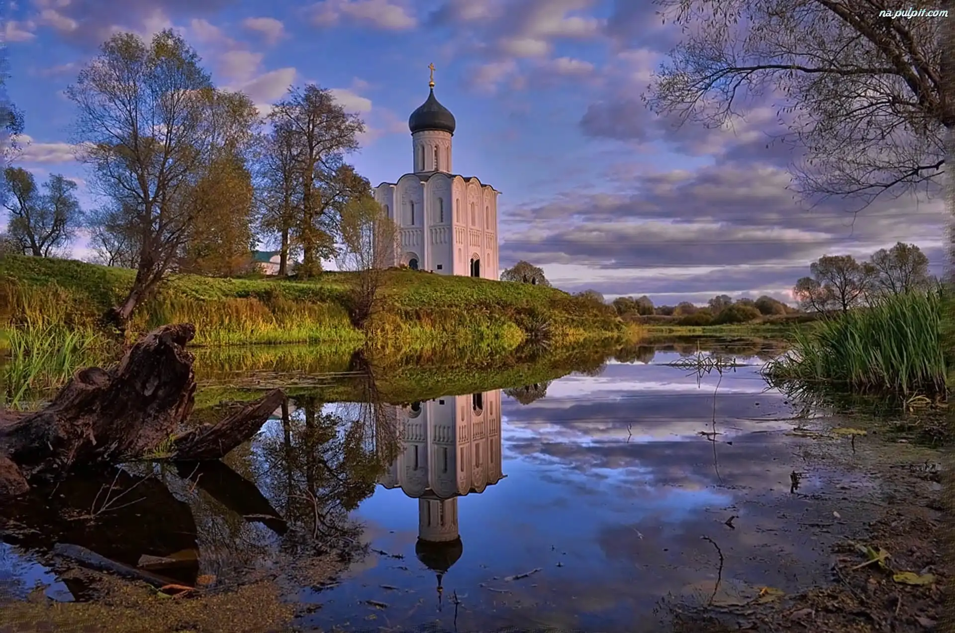 Drzewa, Rzeka, Cerkiew, Chmury Na Pulpit