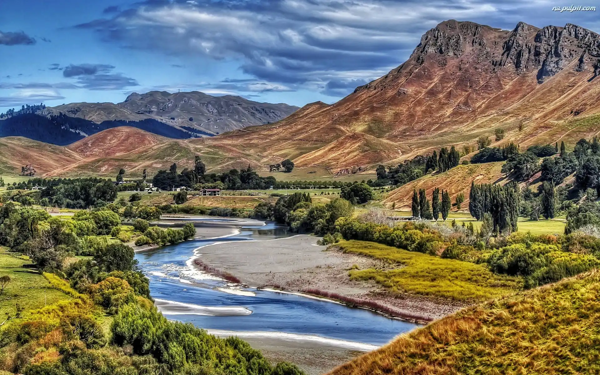 Drzewa, Góry, Chmury, Rzeka Na Pulpit