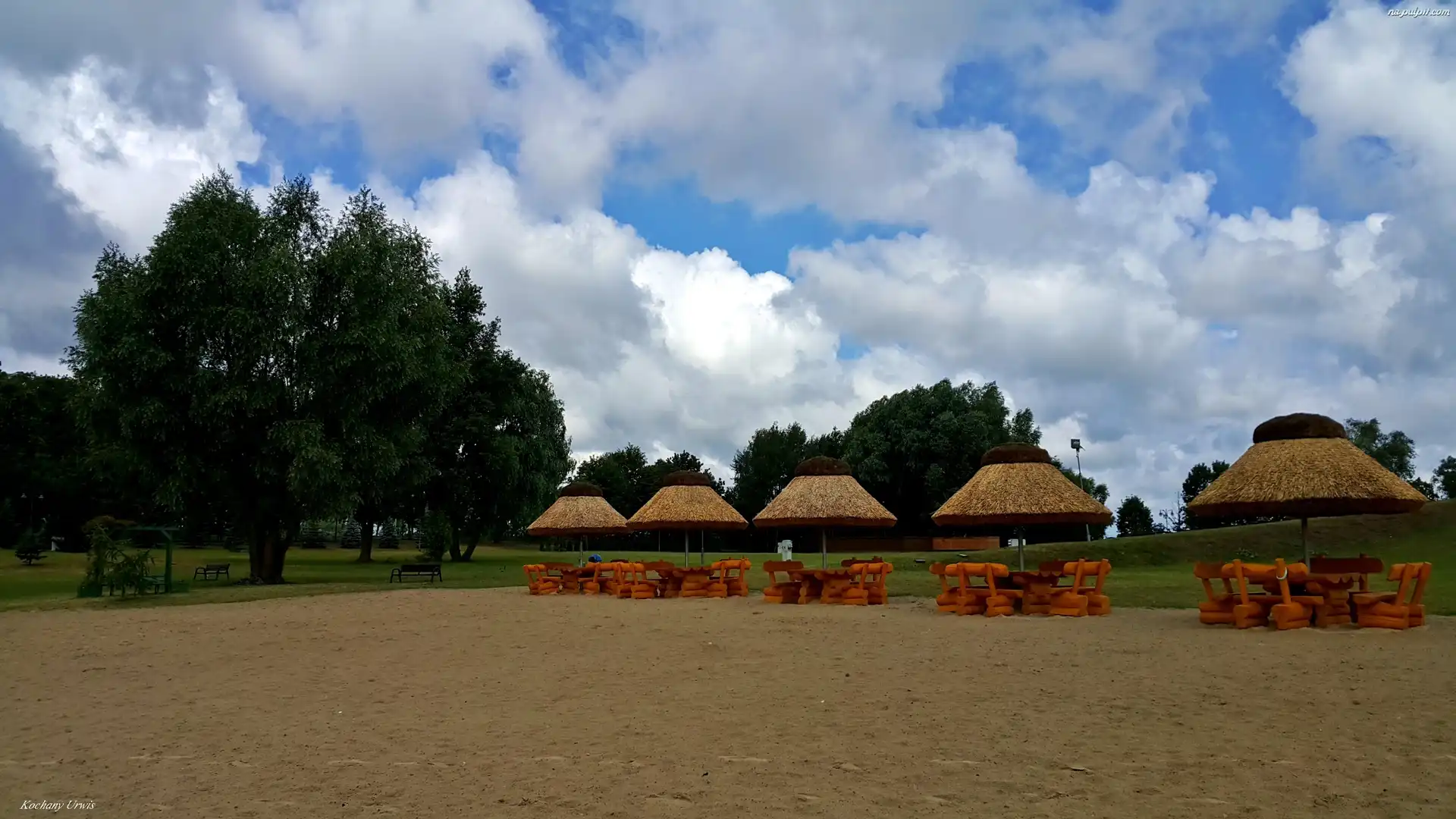 Drzewa, Parasolki, Piasek, Chmury, Ławki Na Pulpit