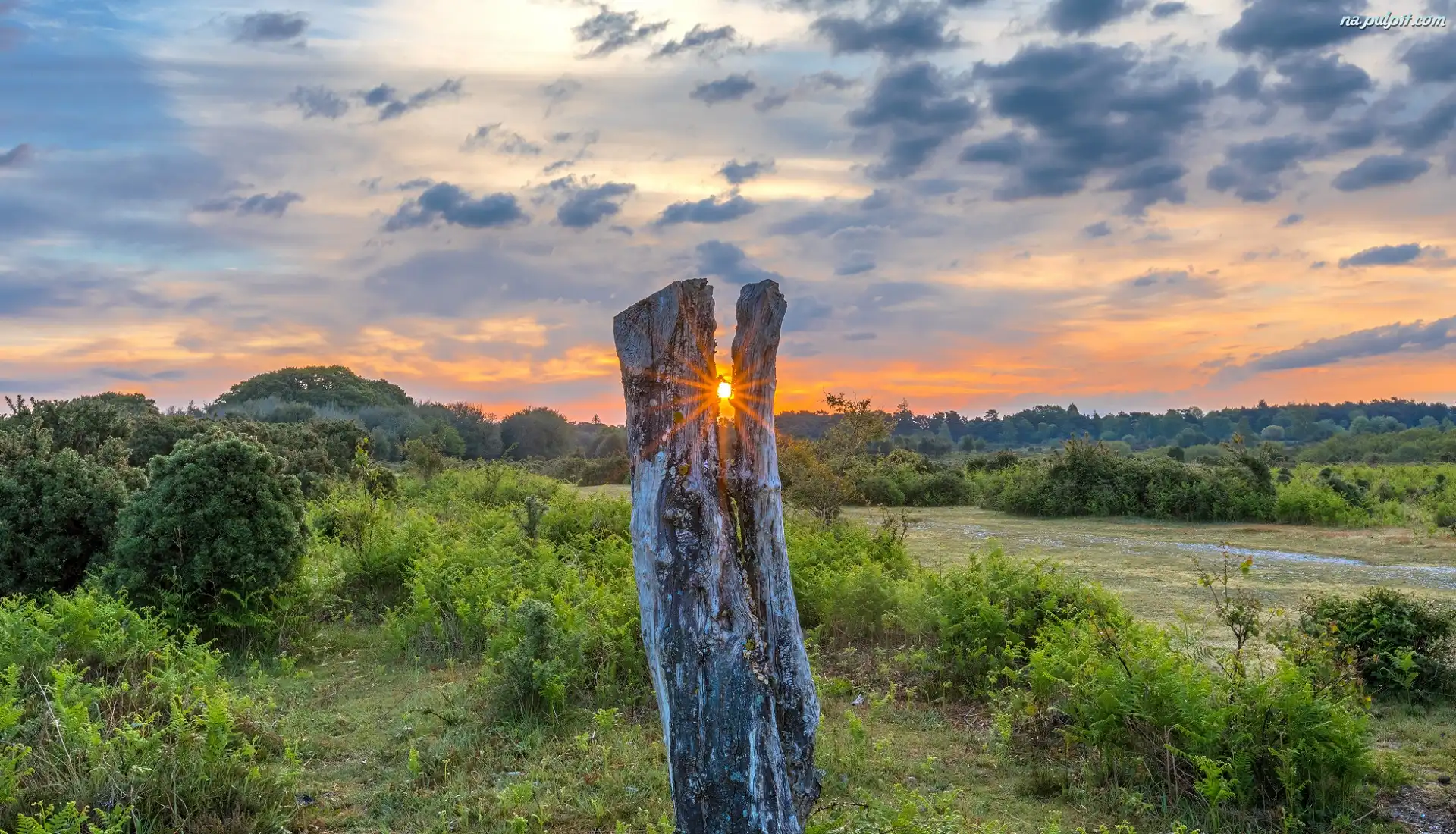 Chmury, Drzewa, Paprocie, Pęknięty, Promienie słońca, Pień Na Pulpit
