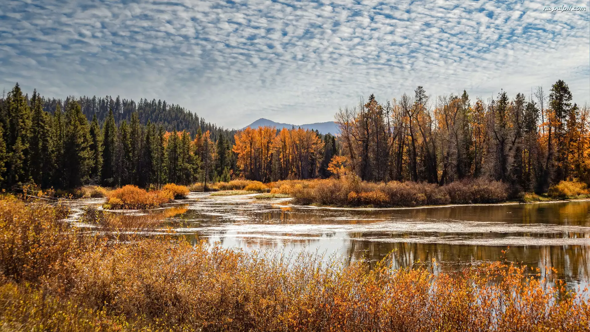 Jesień, Jezioro, Pożółkłe, Drzewa, Szuwary, Chmury Na Pulpit