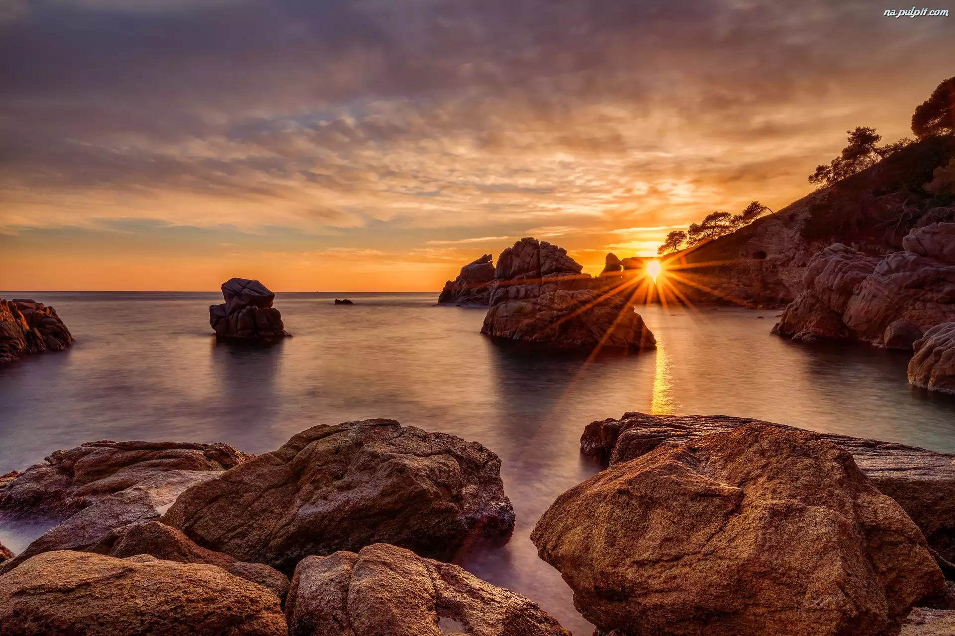 Skały, Drzewa, Promienie słońca, Zachód słońca, Morze, Chmury Na Pulpit