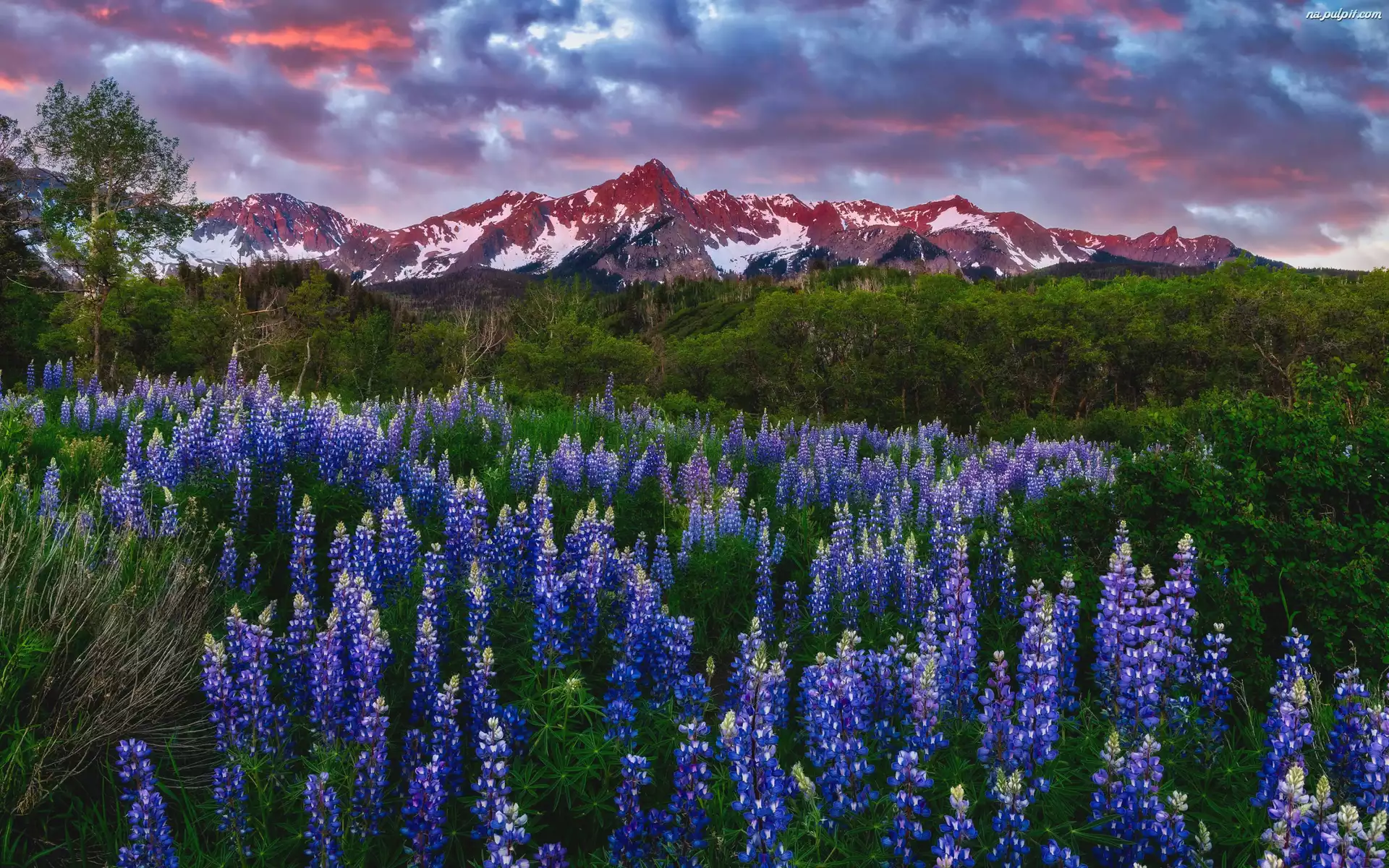 Drzewa, Kwiaty, Zieleń, Góry, Zachód słońca, Chmury, Polana, Łubin Na Pulpit