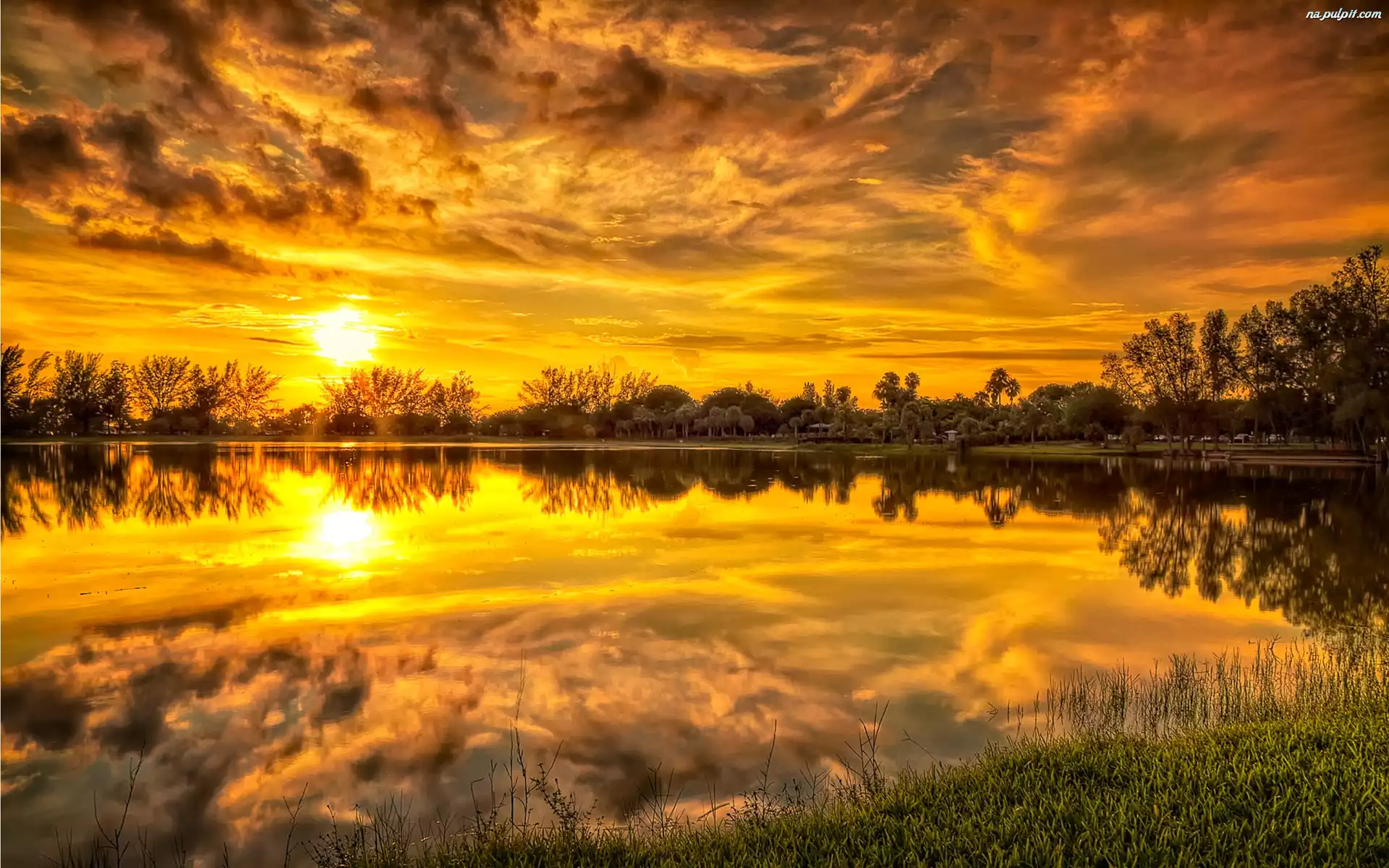 Drzewa, Słońca, Zachód, Chmury, Jezioro Na Pulpit