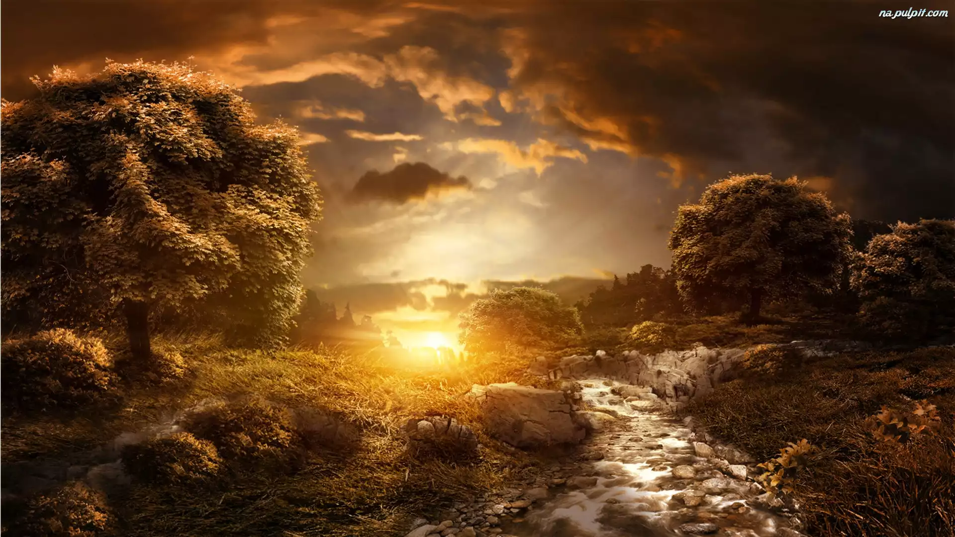 Drzewa, Słońca, Zachód, Chmury, Potok Na Pulpit