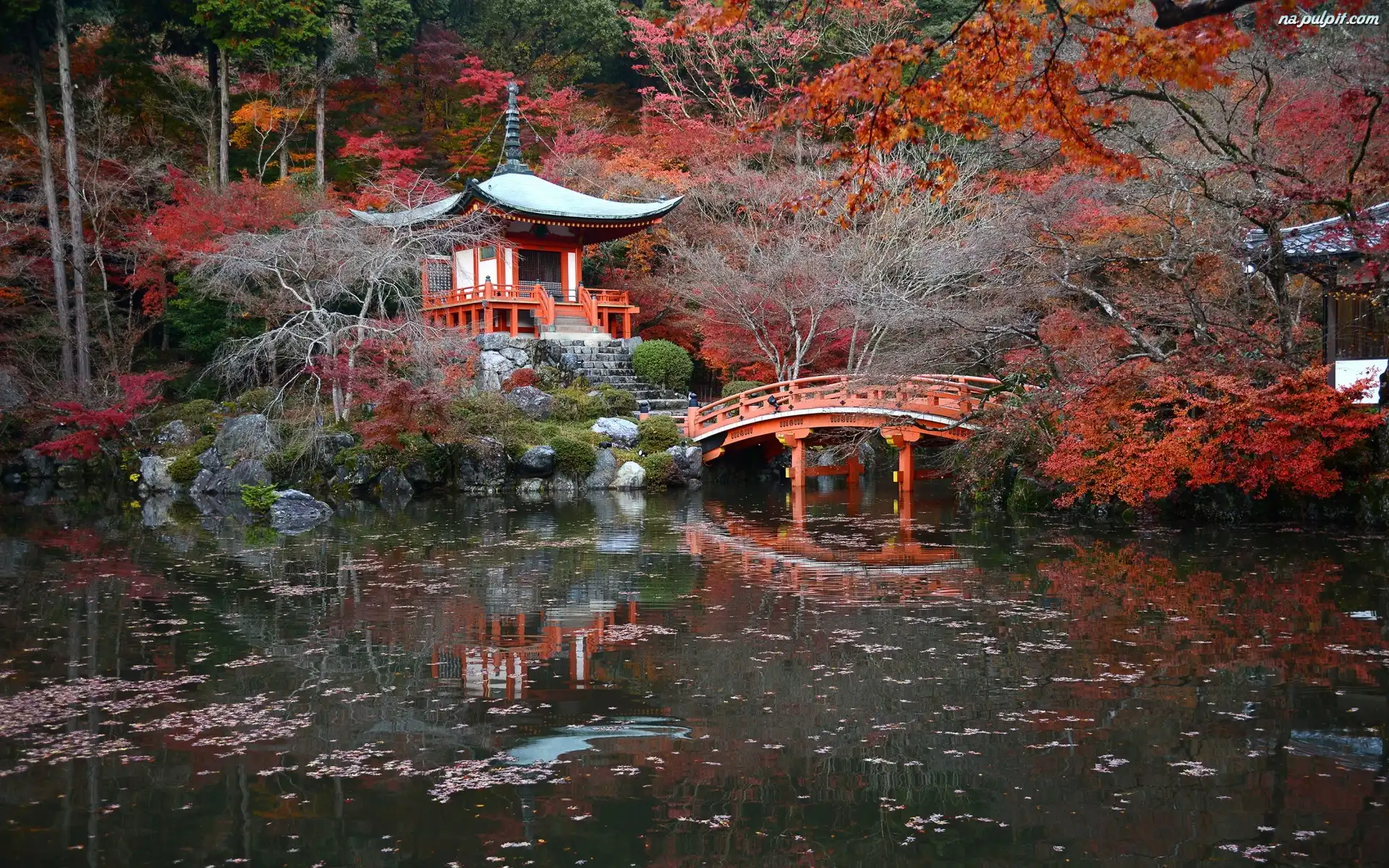 Drzewa, Świątynia Benten-do, Mostek, Kioto, Japonia, Staw, Kompleks świątynny Daigo-ji, Jesień Na Pulpit |