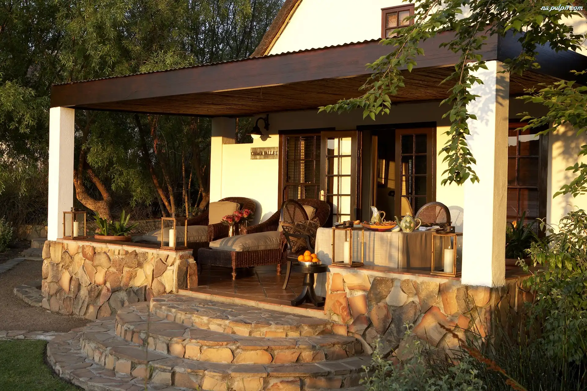 Drzewa, Leżanki, Weranda, Dom, Schodki