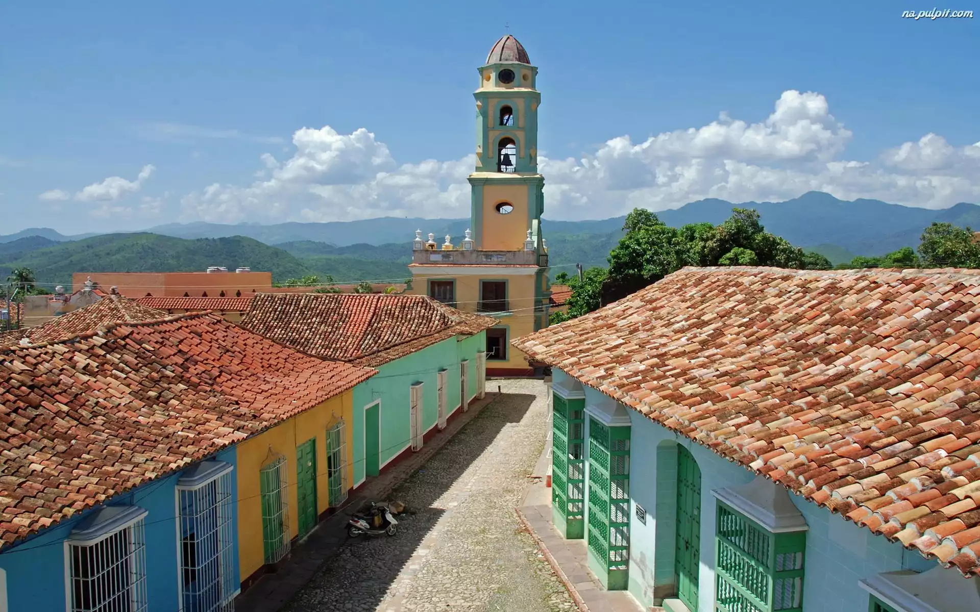 Drzewa, Uliczka, Kościół, Domy, Góry