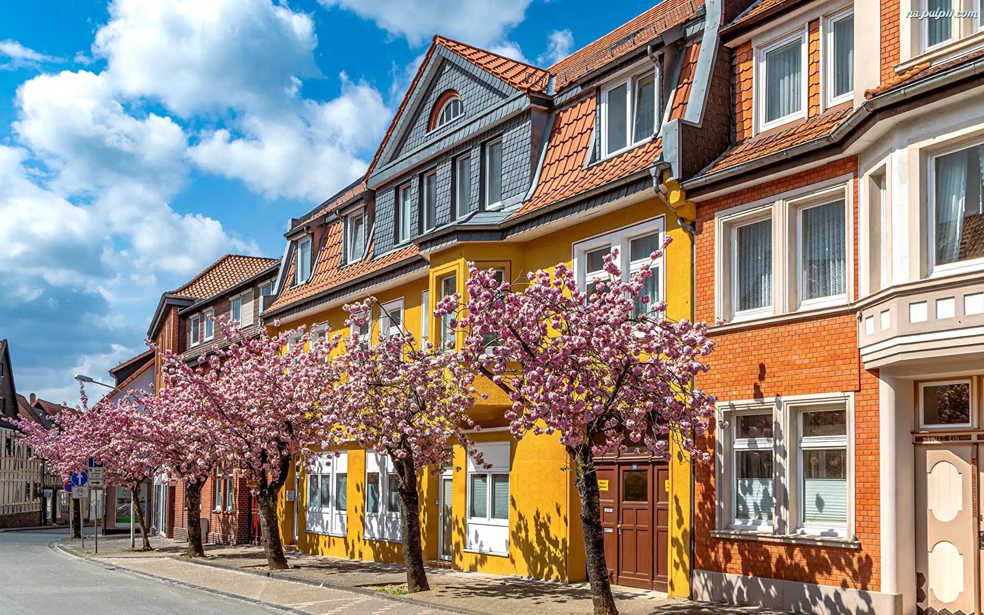 Domy, Ulica, Kwitnące, Drzewa Na Pulpit