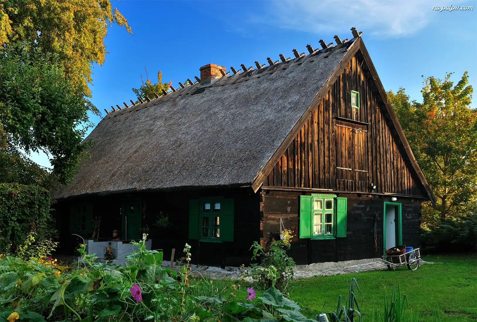 Drzewa, Trawa, Domek, Drewniany, Kwiatki Na Pulpit