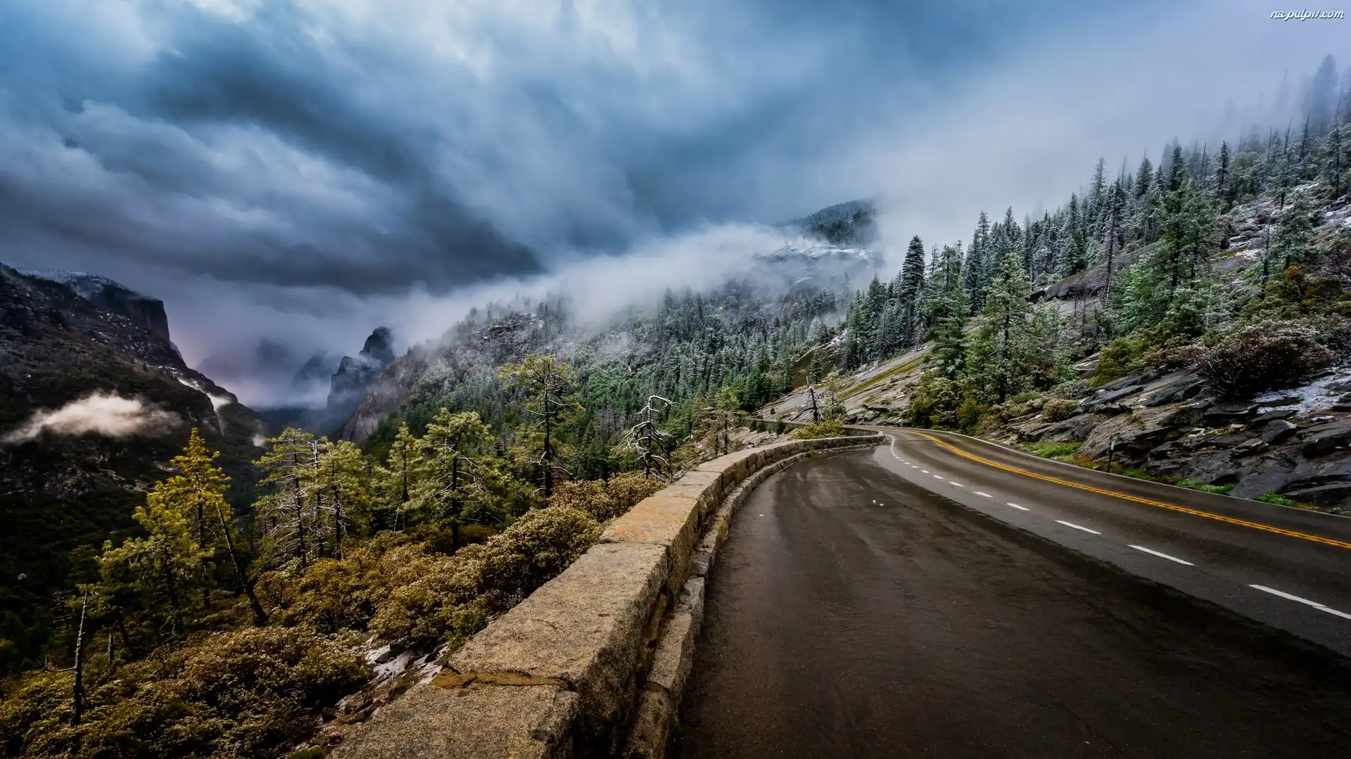 Drzewa, Mgła, Góry, Droga, Chmury Na Pulpit
