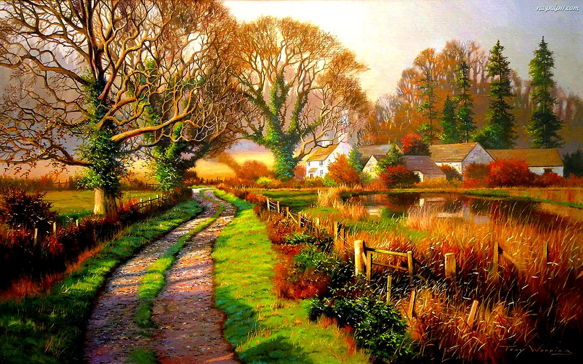 Drzewa, Staw, Jesień, Domy, Droga, Wioska Na Pulpit