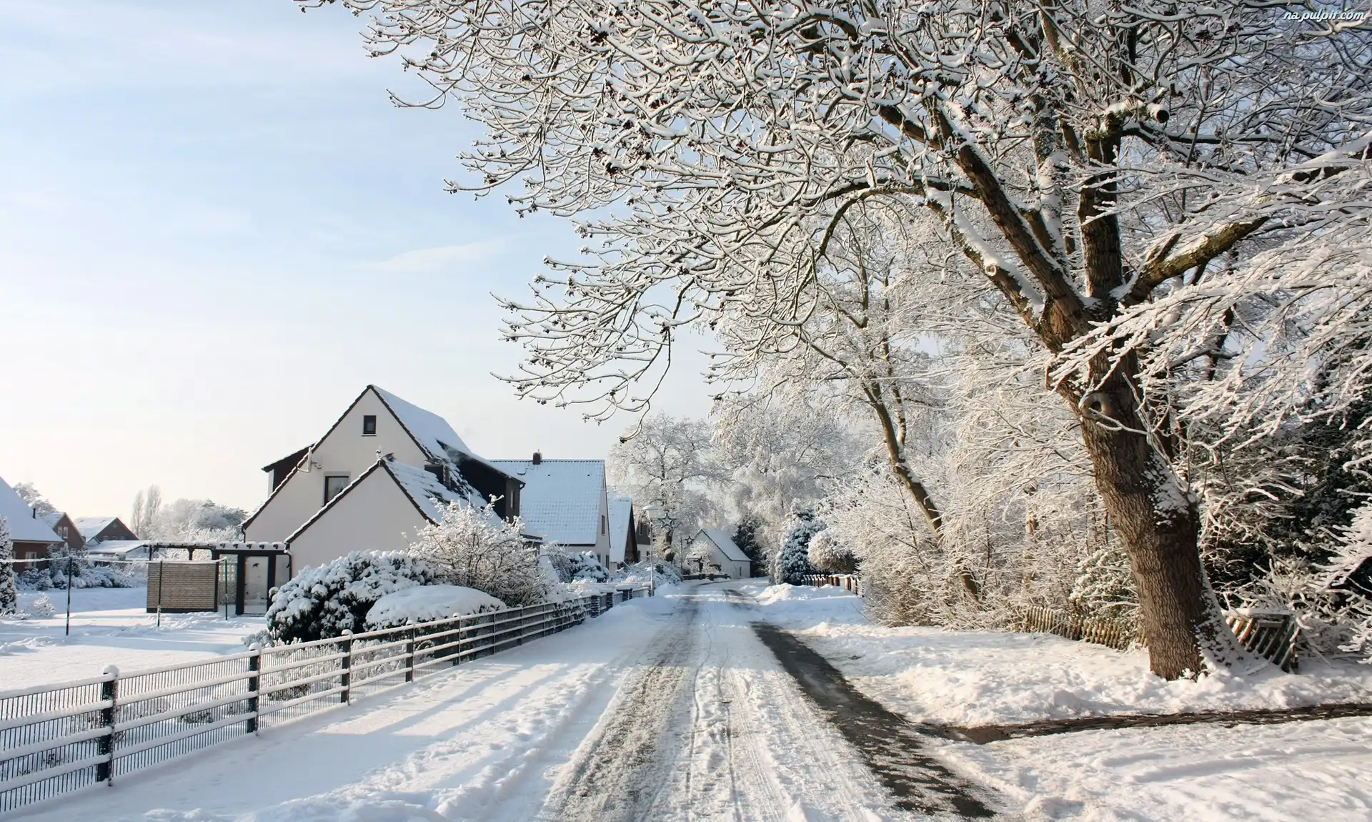 Drzewa, Śnieg, Droga, Domy Na Pulpit