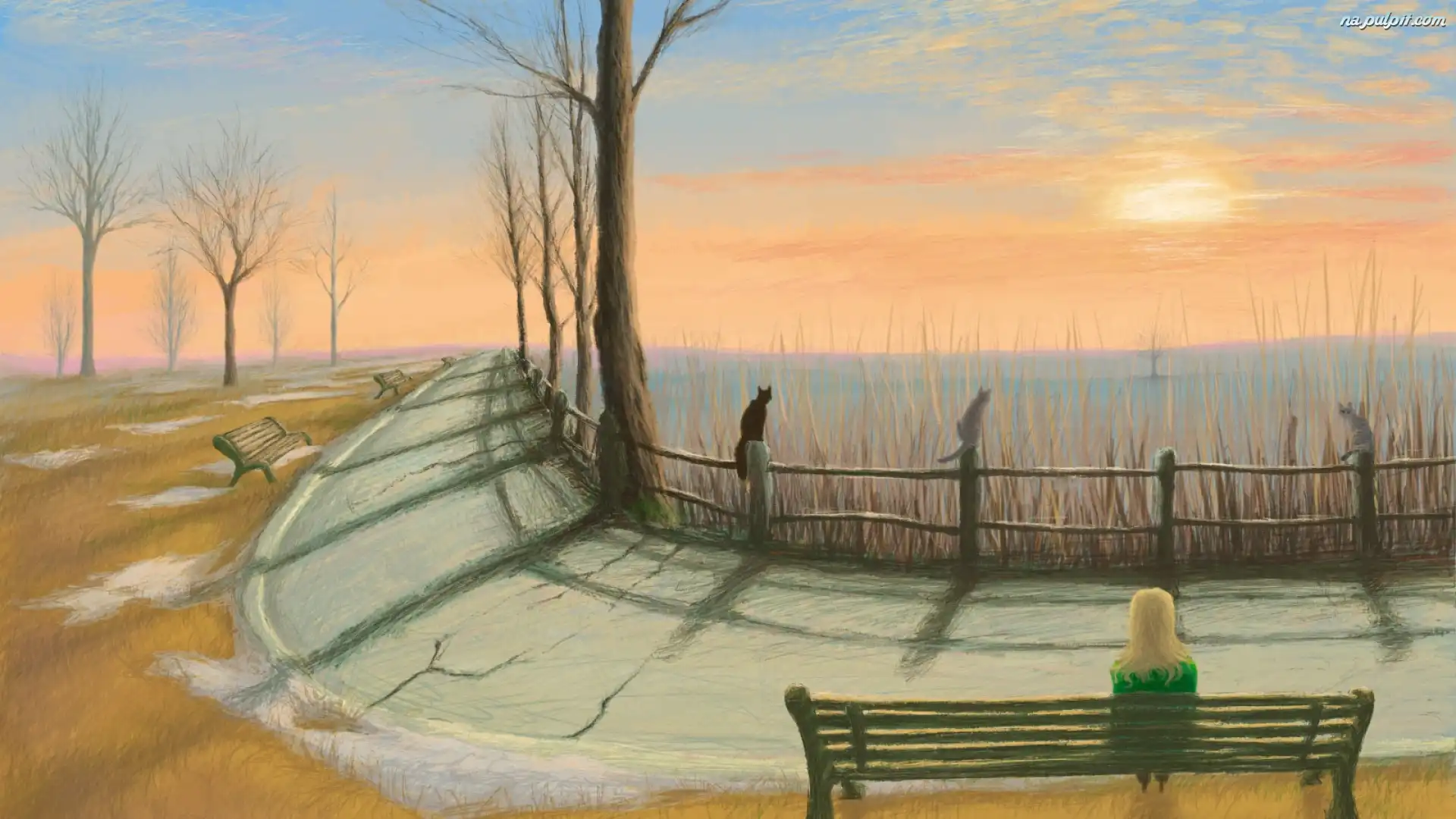 Drzewa, Koty, Ławki, Dróżka, Płot Na Pulpit