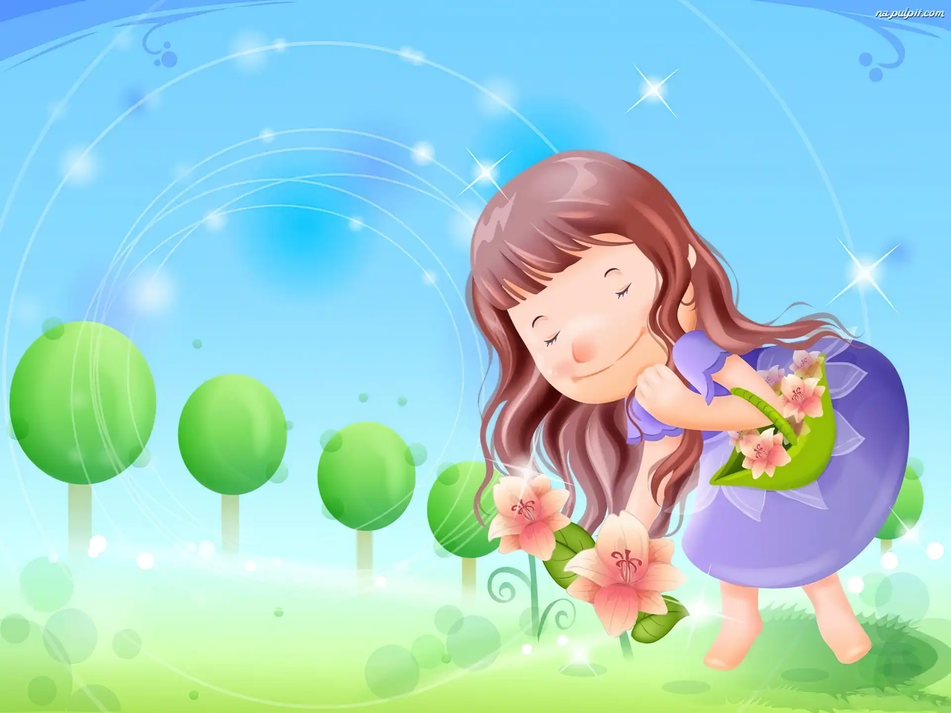 Drzewa, Łąka, Dziecko, Kwiaty Na Pulpit