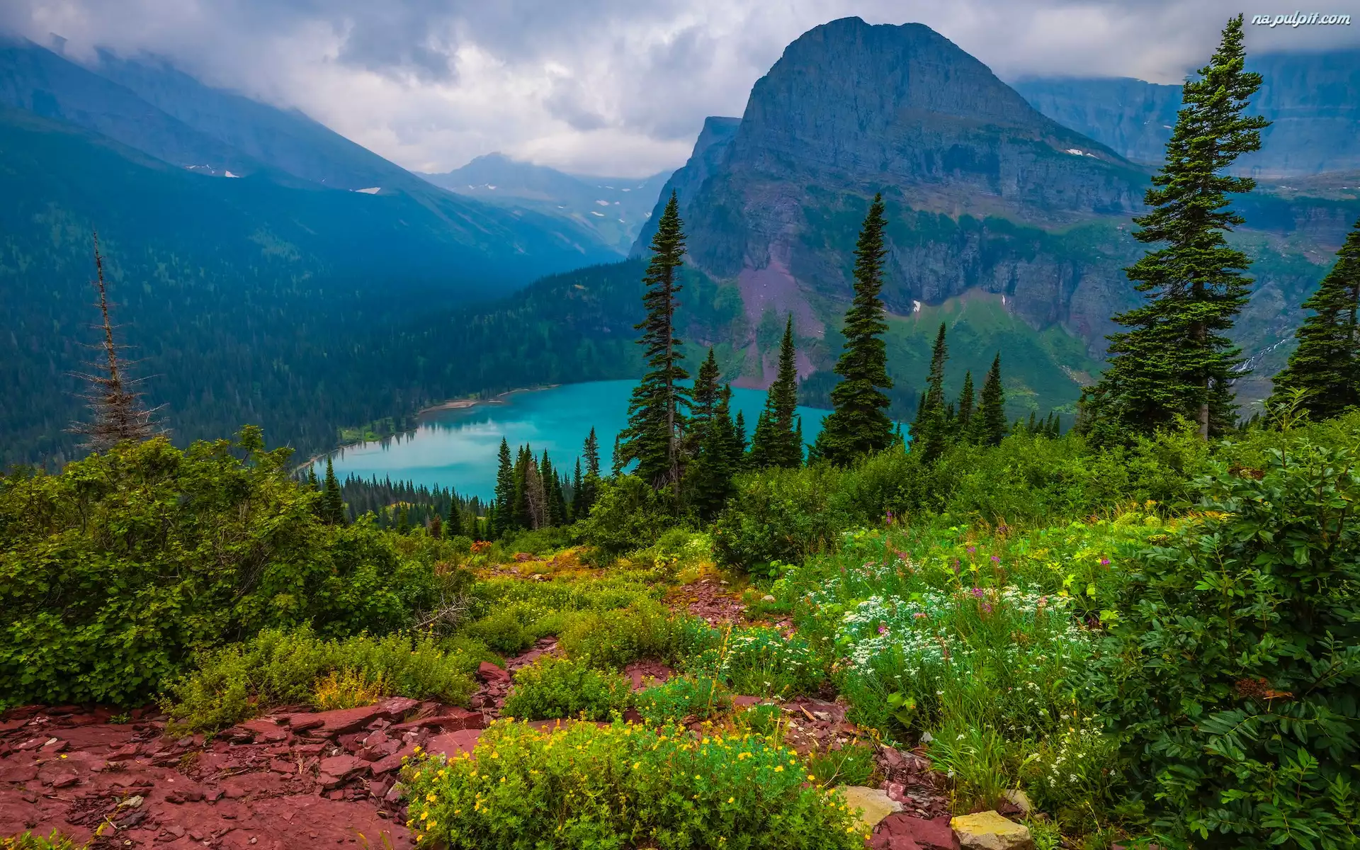 Rośliny, Chmury, Montana, Drzewa, Góry, Stany Zjednoczone, Park Narodowy Glacier, Grinnell Lake, Jezioro Na Pulpit |