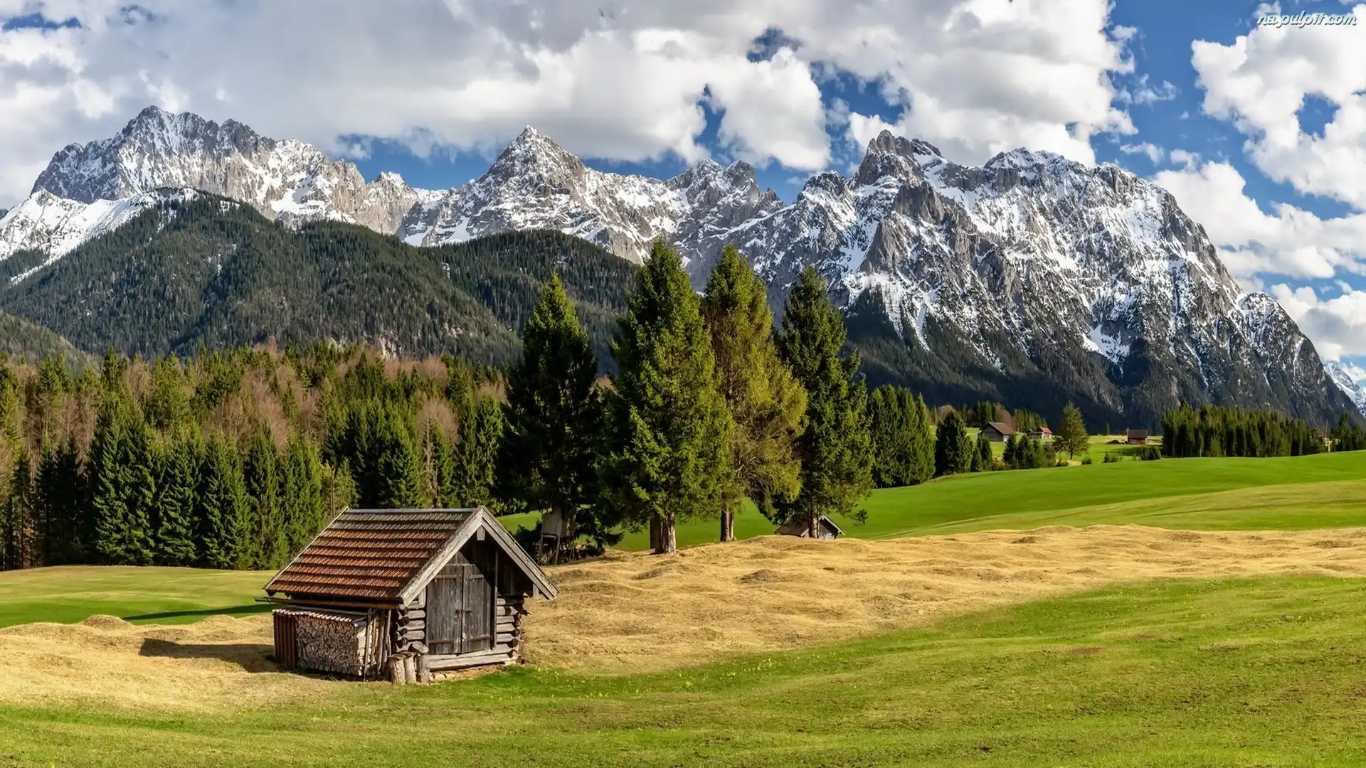 Drewniany, Bawaria, Góry Karwendel, Domek, Chmury, Las, Niemcy, Drzewa Na Pulpit