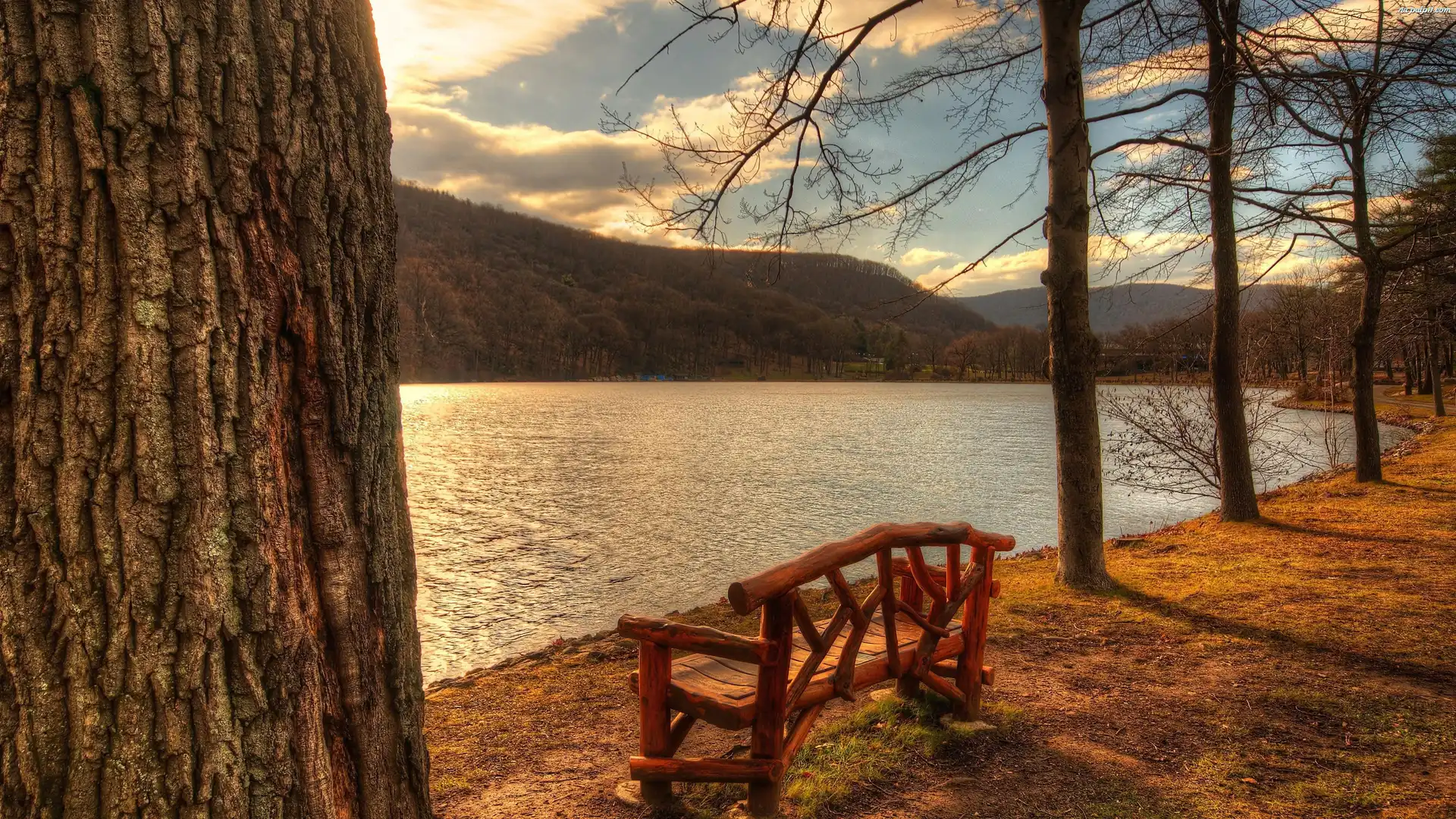 Drzewa, Jezioro, Góry, Ławka