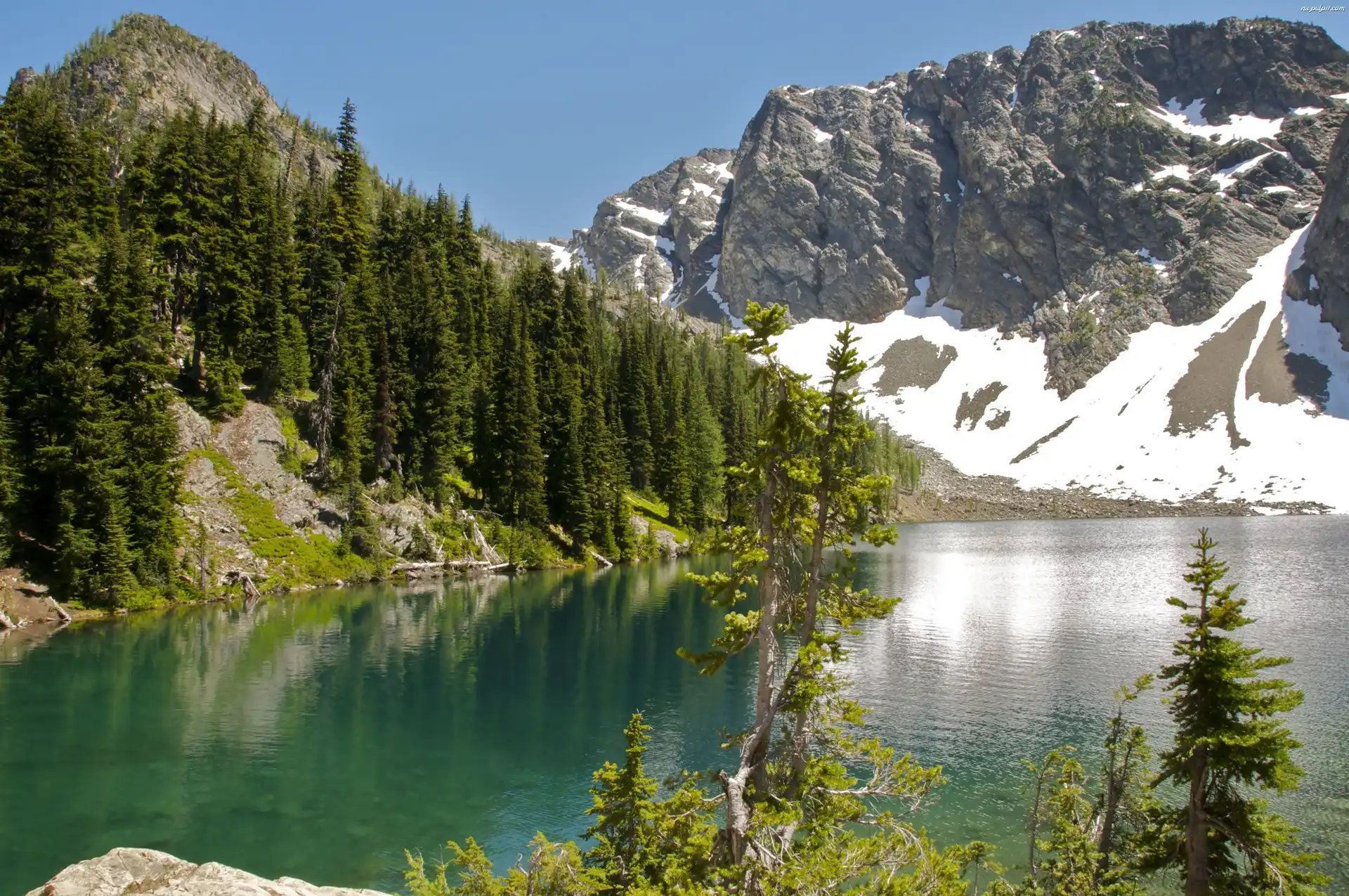 Drzewa, Jezioro, Góry, Śnieg