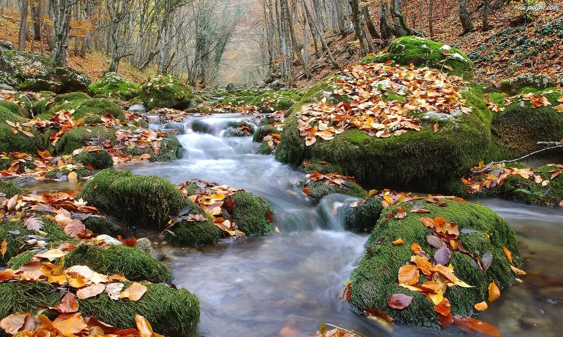 Góry, Drzewa, Trawa, Strumyk, Liście, Jesień, Kamienie Na Pulpit