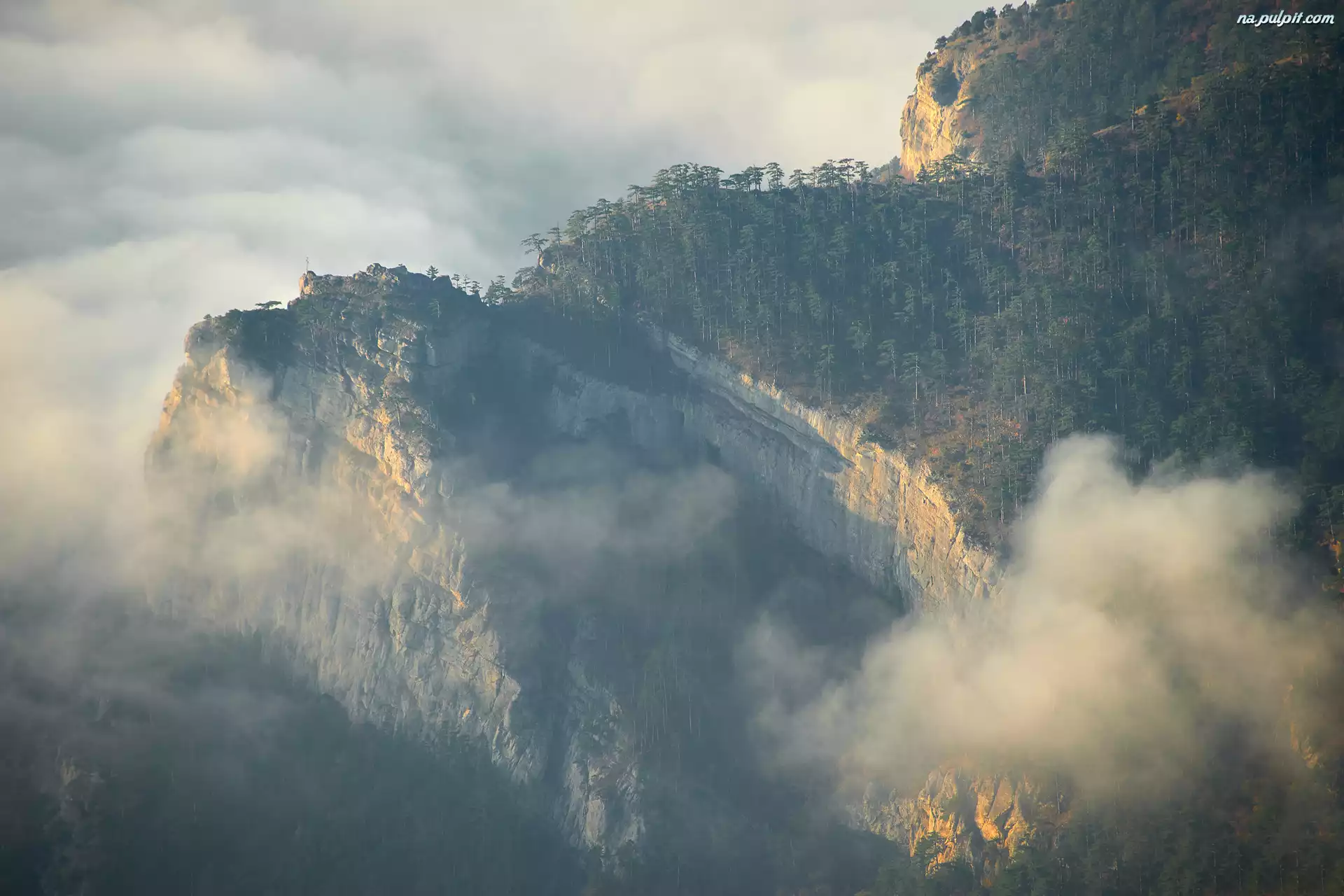 Drzewa, Mgła, Góry, Chmury Na Pulpit