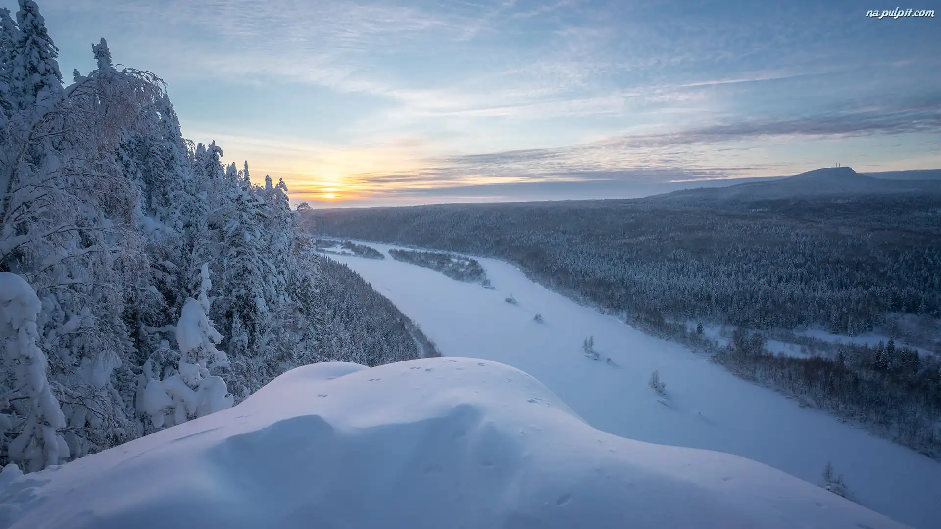 Góry, Drzewa, Wschód słońca, Lasy, Zima, Ośnieżone Na Pulpit