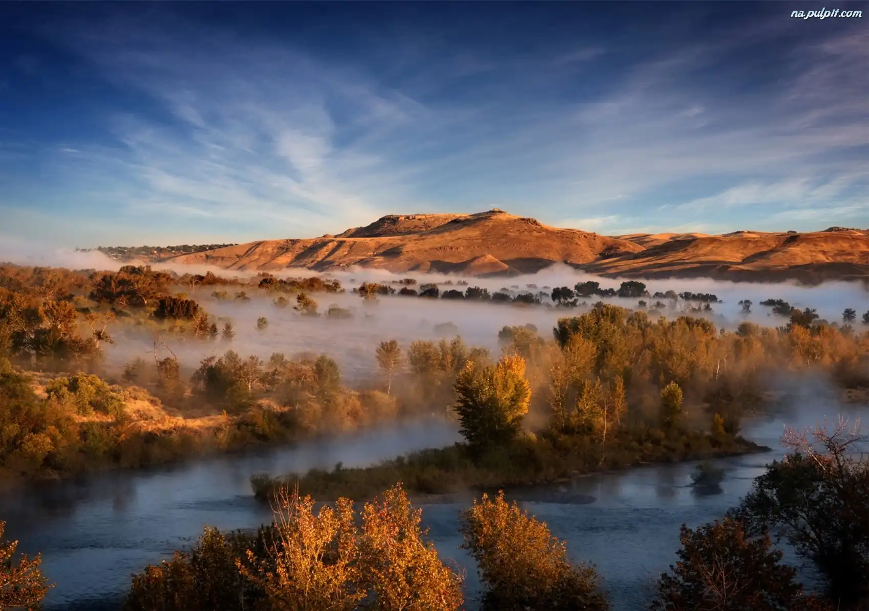 Drzewa, Rzeka, Góry, Mgła Na Pulpit