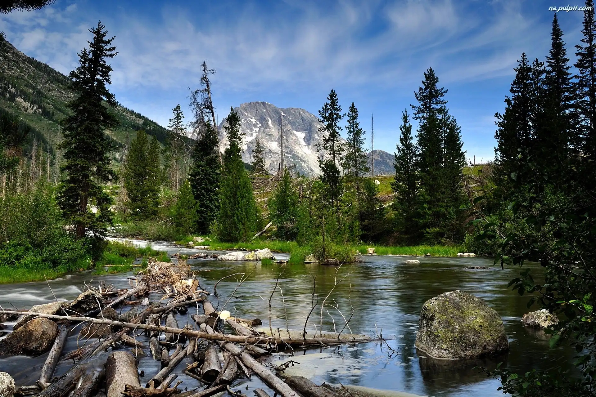Drzewa, Rzeka, Góry, Powalone Na Pulpit