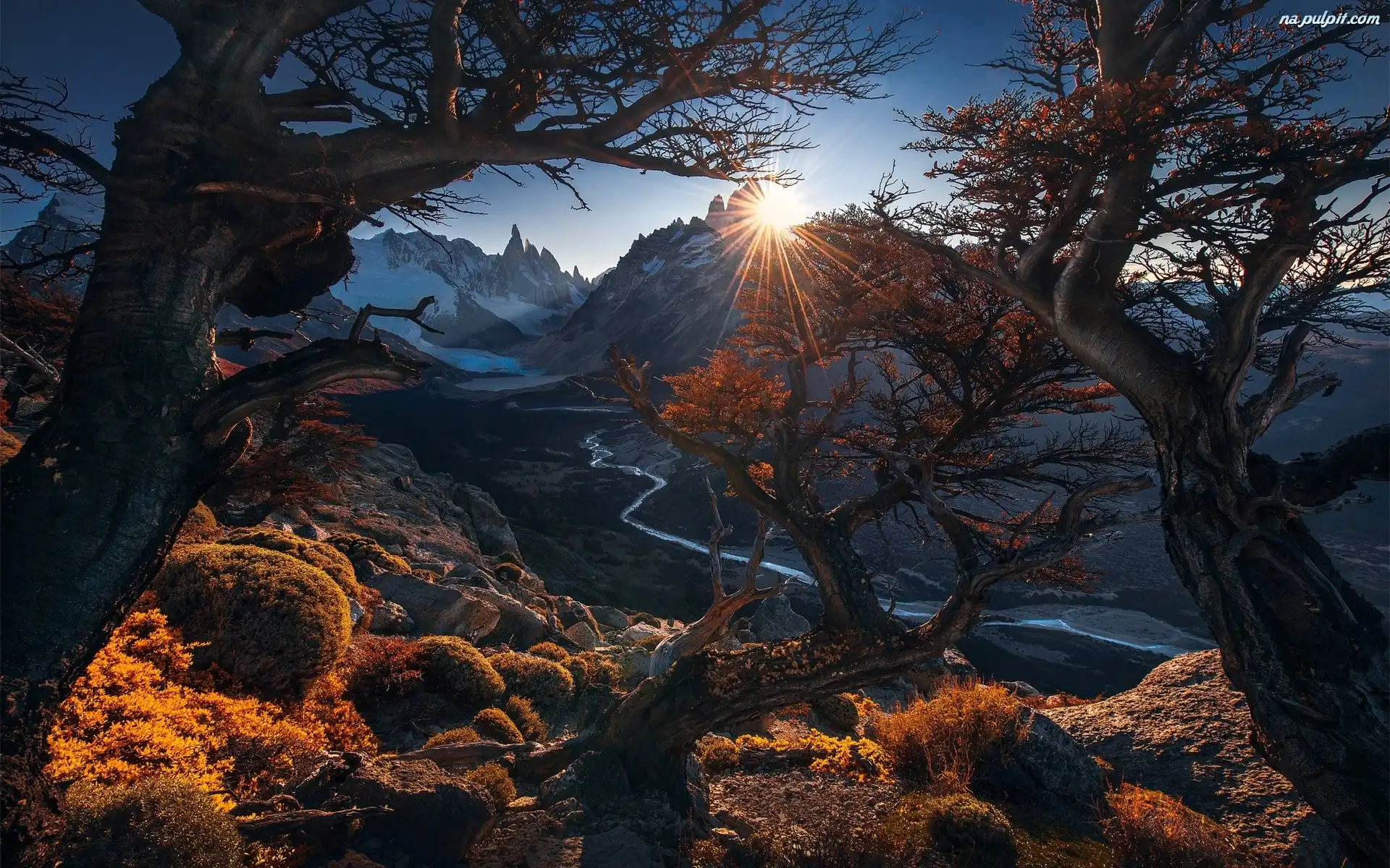 Drzewa, Promienie, Rzeka, Góry, Słońca Na Pulpit