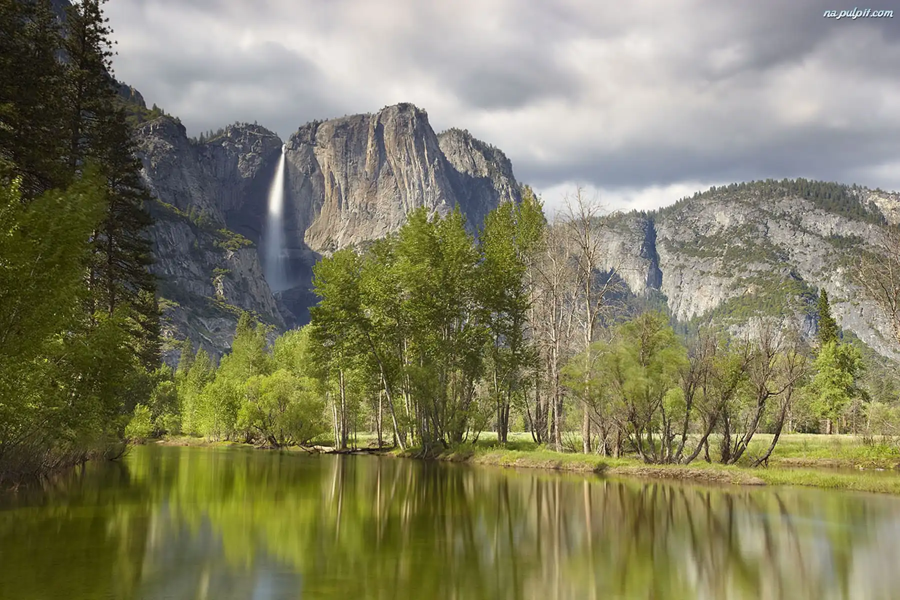 Drzewa, Wodospad, Góry, Jezioro Na Pulpit