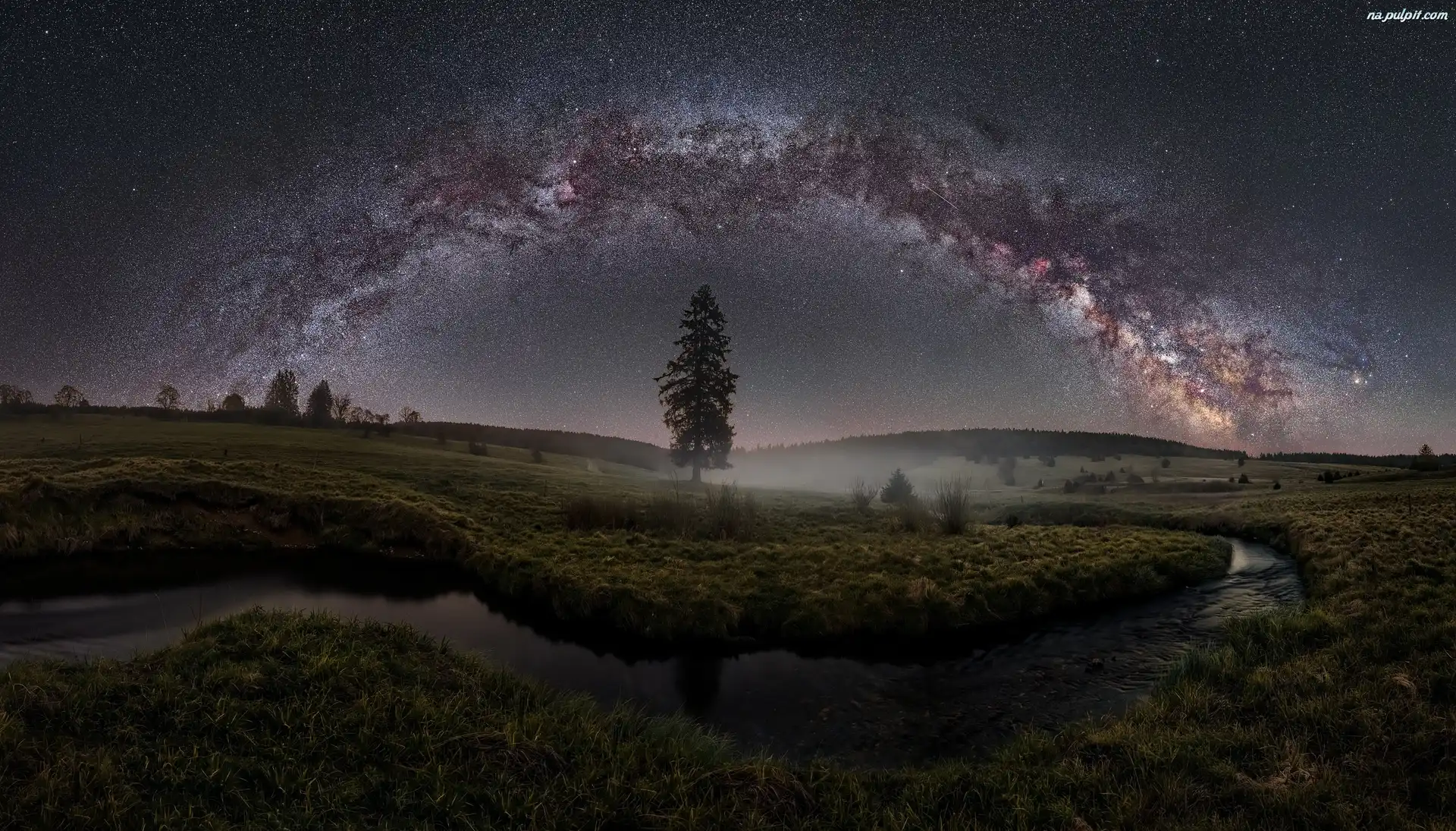 Gwiazdy, Drzewa, Rzeka, Noc, Droga Mleczna, Mgła Na Pulpit