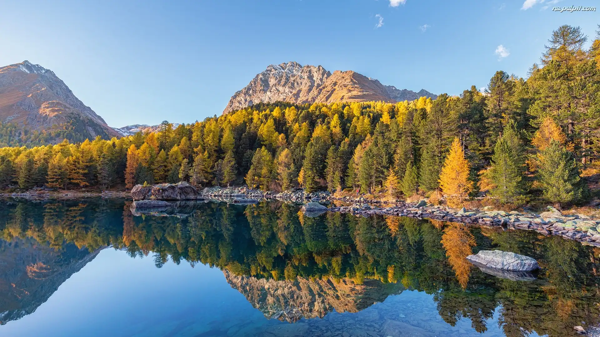 Drzewa, Kanton Gryzonia, Góry Alpy, Dolina Val di Campo, Jesień, Odbicie, Jezioro Lago di Saoseo, Szwajcaria, Kamienie Na Pulpit |