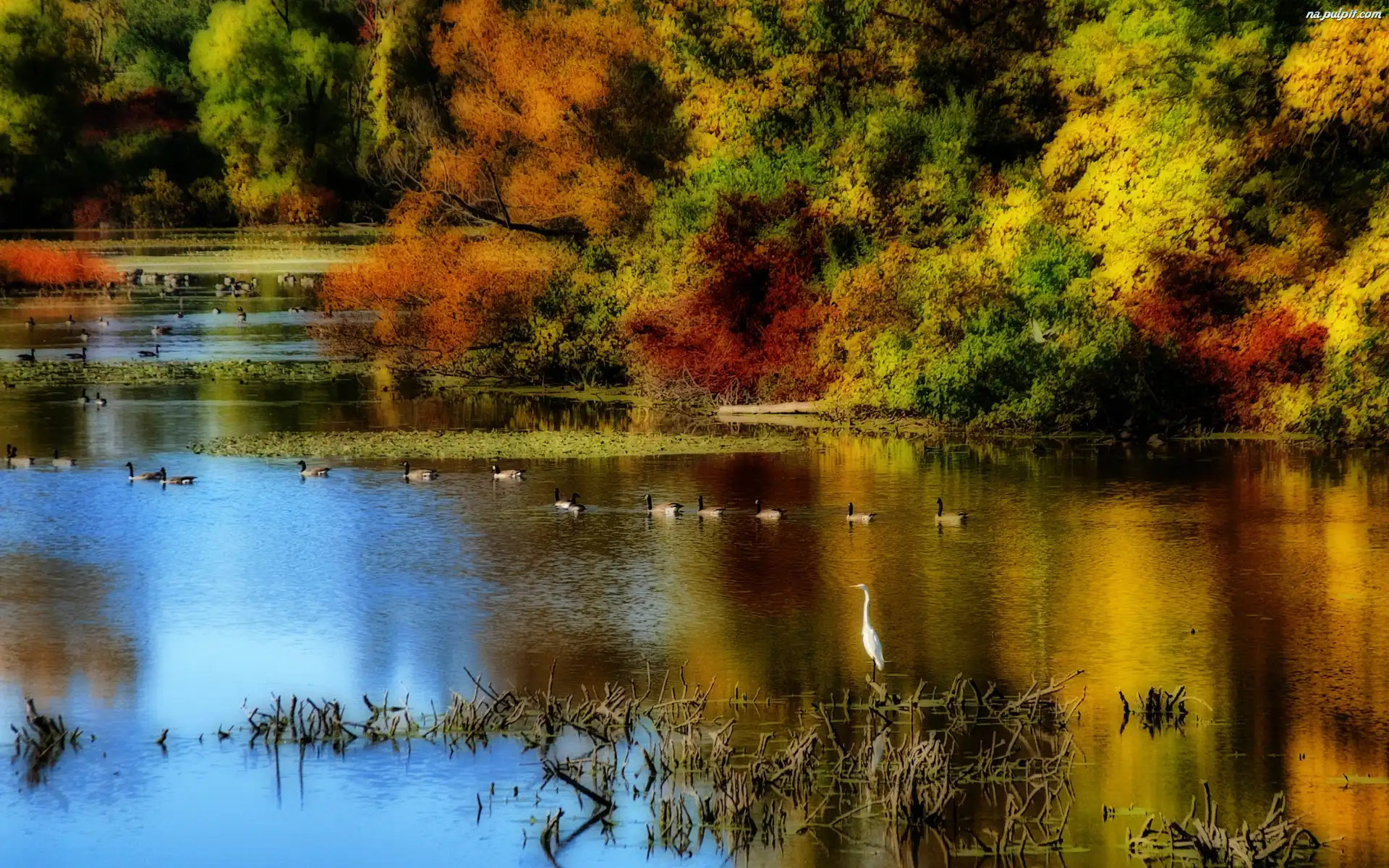 Drzewa, Jezioro, Jesień, Kaczki Na Pulpit
