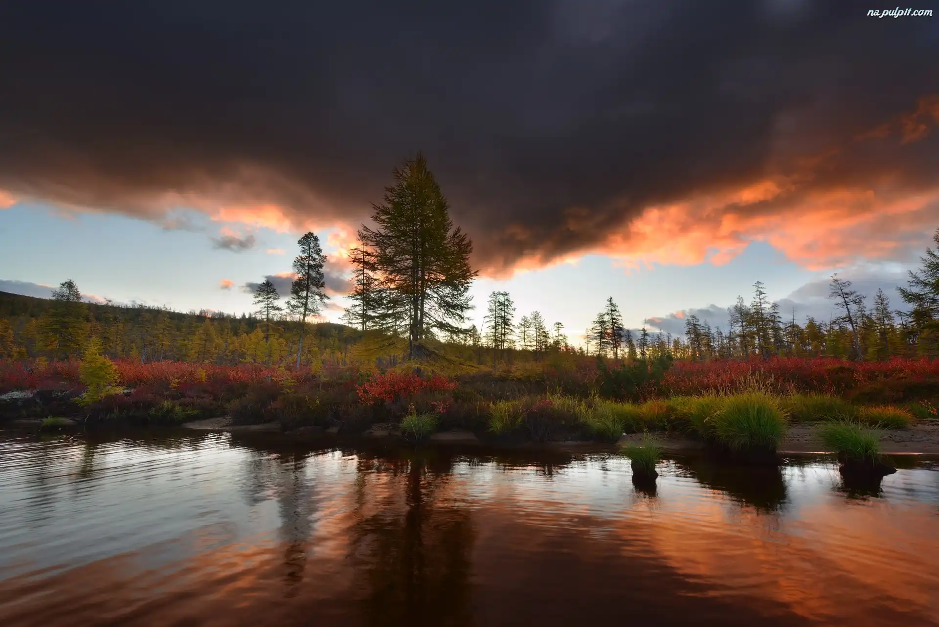 Drzewa, Ciemne, Zachmurzone, Jesień, Kołyma, Obwód magadański, Rosja, Niebo, Jezioro Jack London, Chmury Na Pulpit |