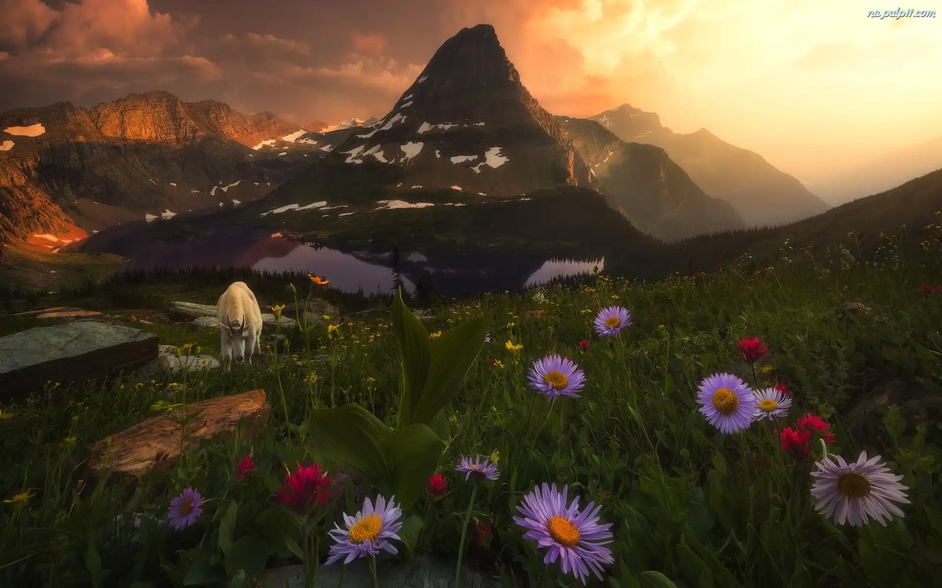 Łąka, Jezioro, Chmury, Kwiaty, Kozioł śnieżny, Góry, Drzewa Na Pulpit