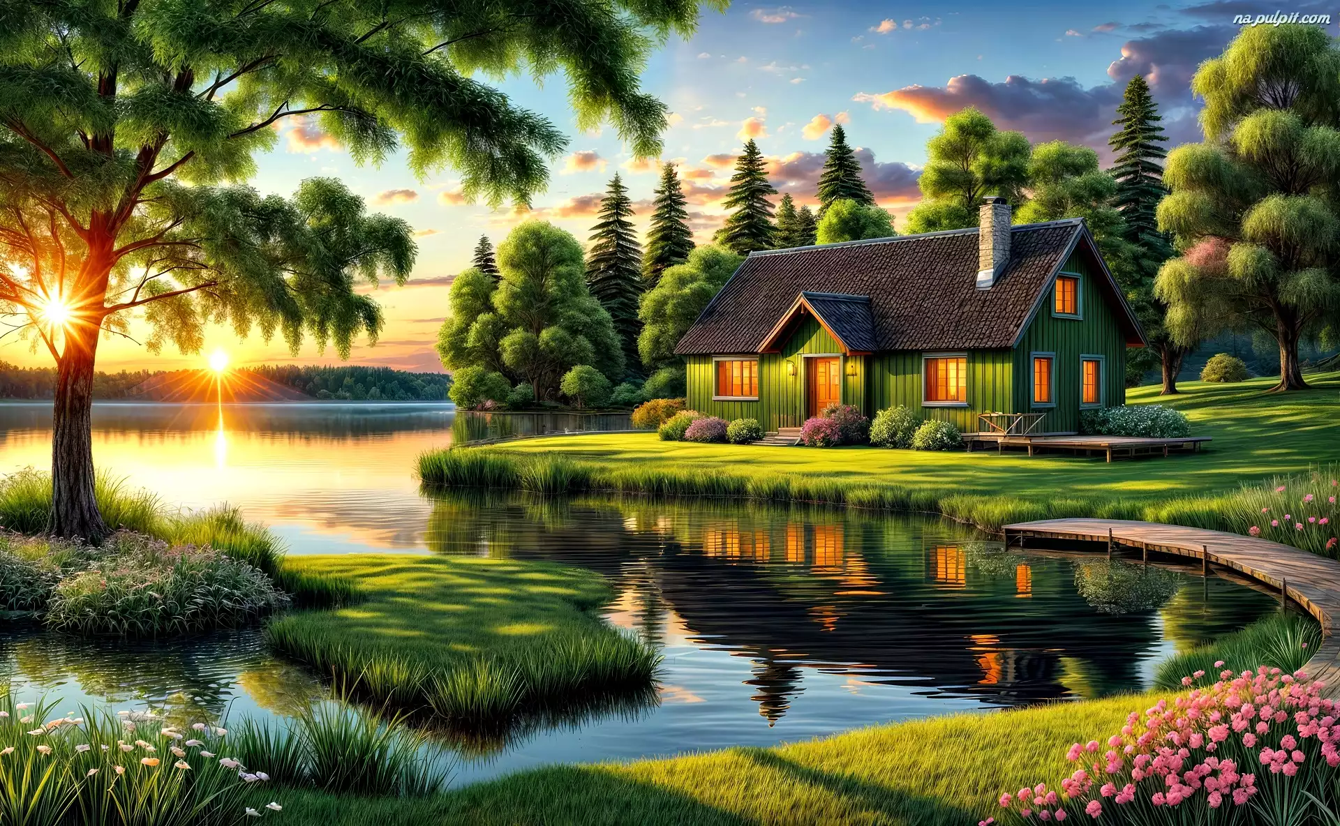 Zachód słońca, Dom, Drzewa, Grafika, Jezioro Na Pulpit