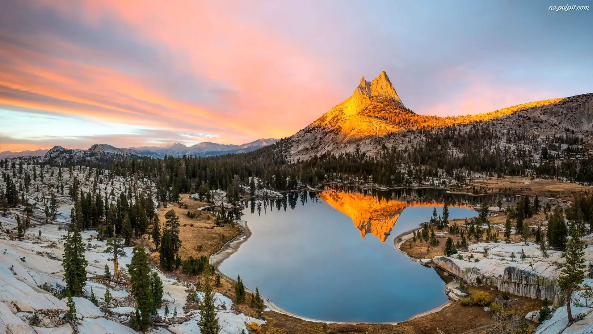 Drzewa, Szczyt, Góry, Jezioro, Odbicie Na Pulpit