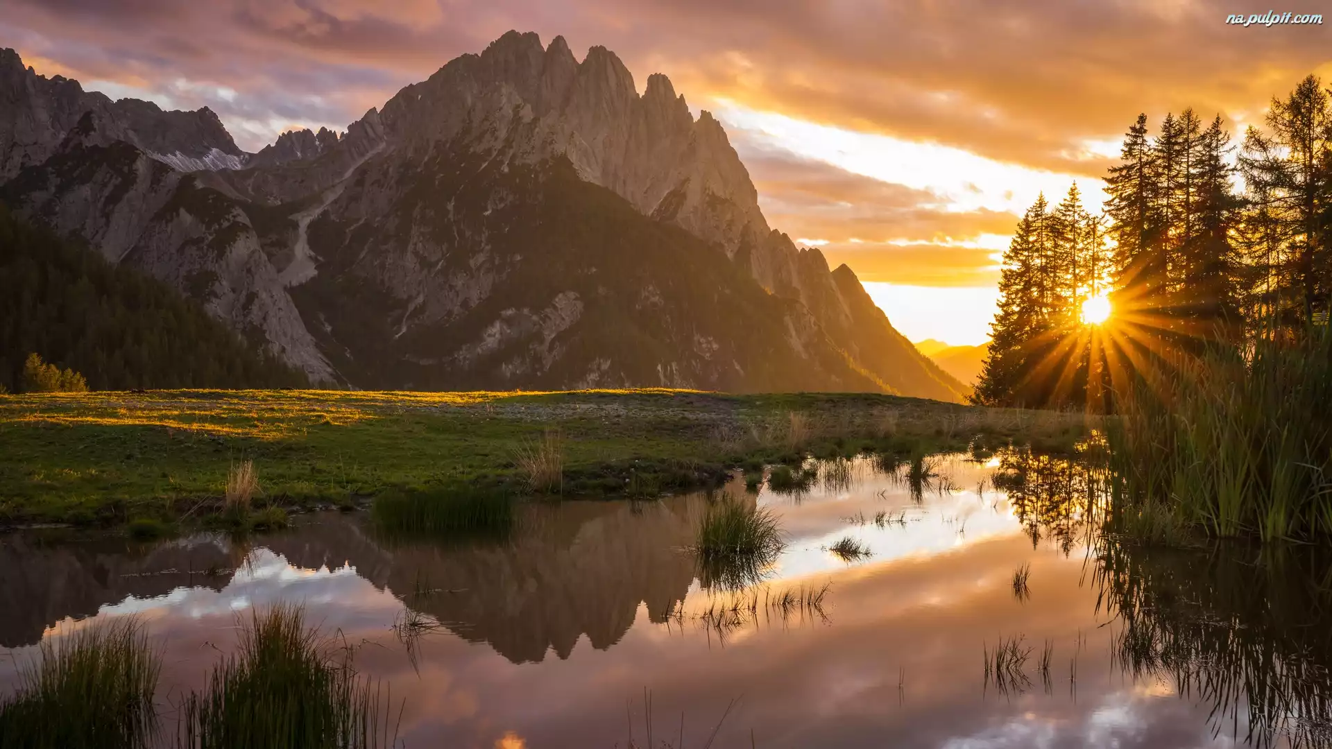 Wschód słońca, Góry, Drzewa, Chmury, Jezioro Na Pulpit