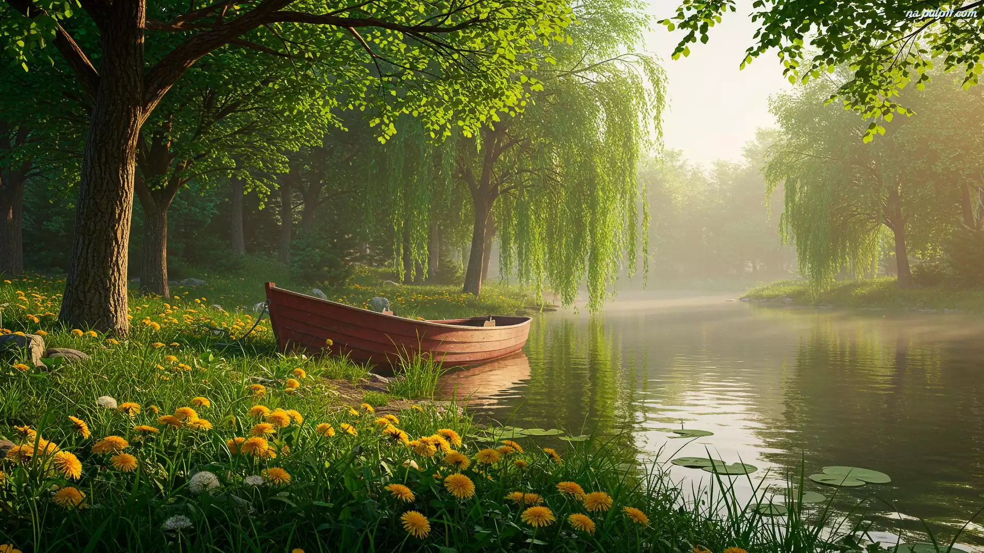 Jezioro, Łódka, Kwiaty, Drzewa Na Pulpit
