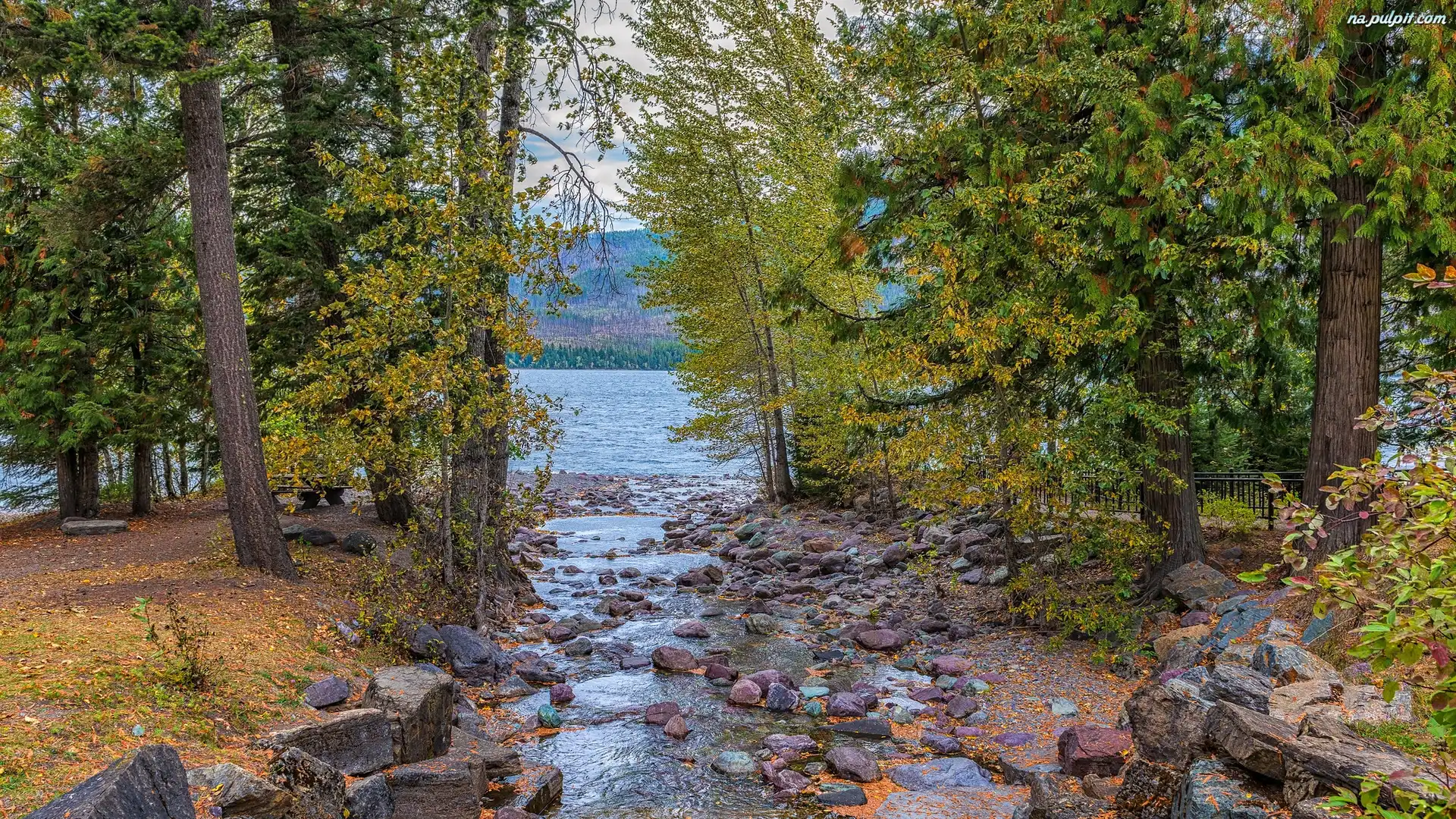 Stany Zjednoczone, Park Narodowy Glacier, Kamienie, Drzewa, Jezioro, Lake McDonald, Montana Na Pulpit |
