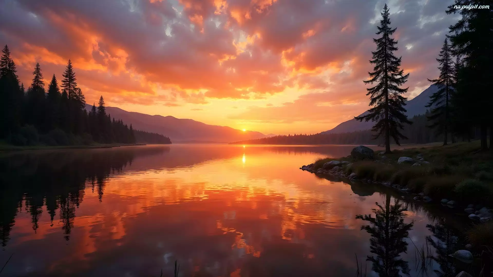 Zachód słońca, Jezioro, Drzewa, Grafika AI, Góry Na Pulpit