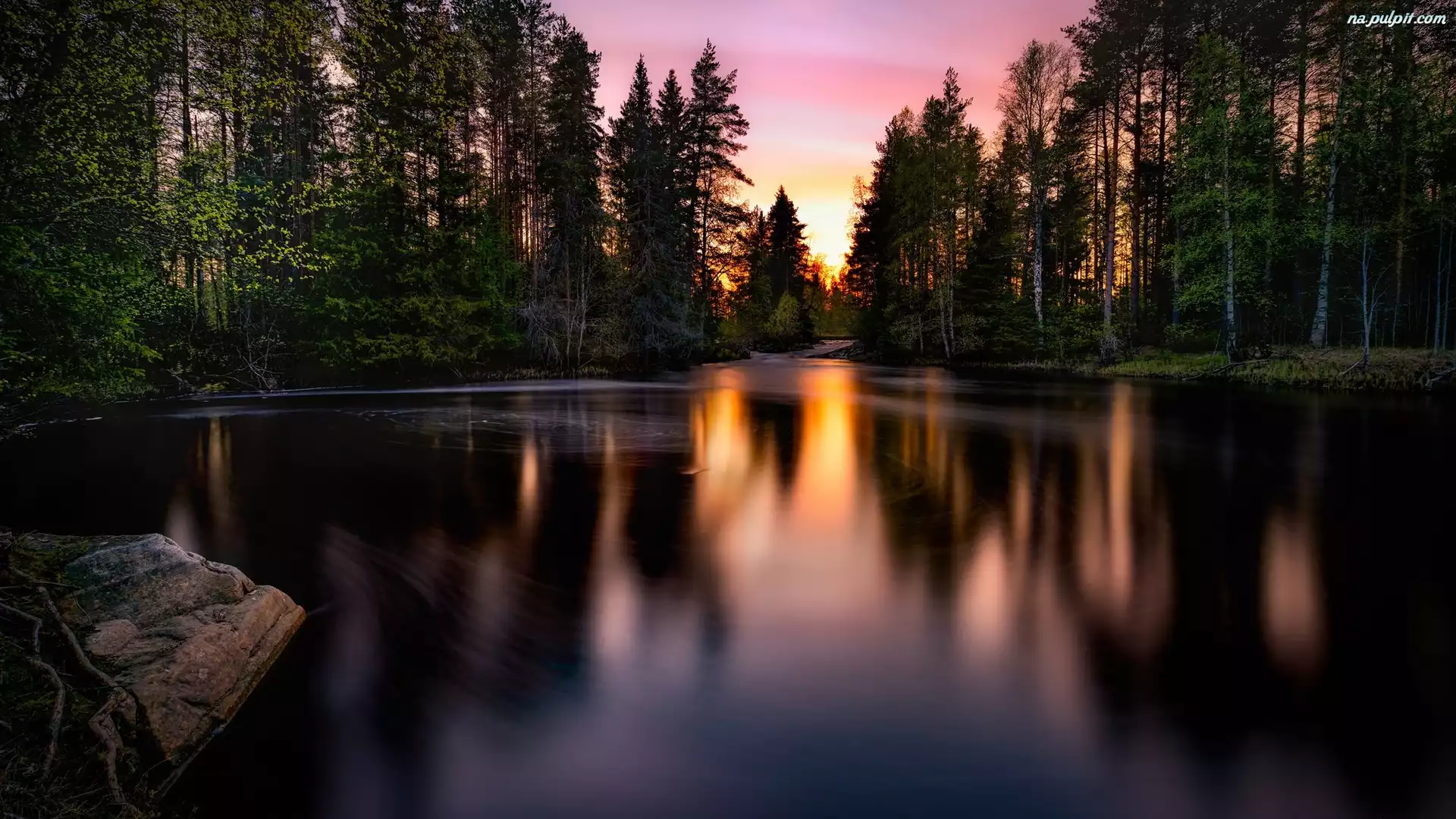 Drzewa, Zachód słońca, Jezioro, Las Na Pulpit