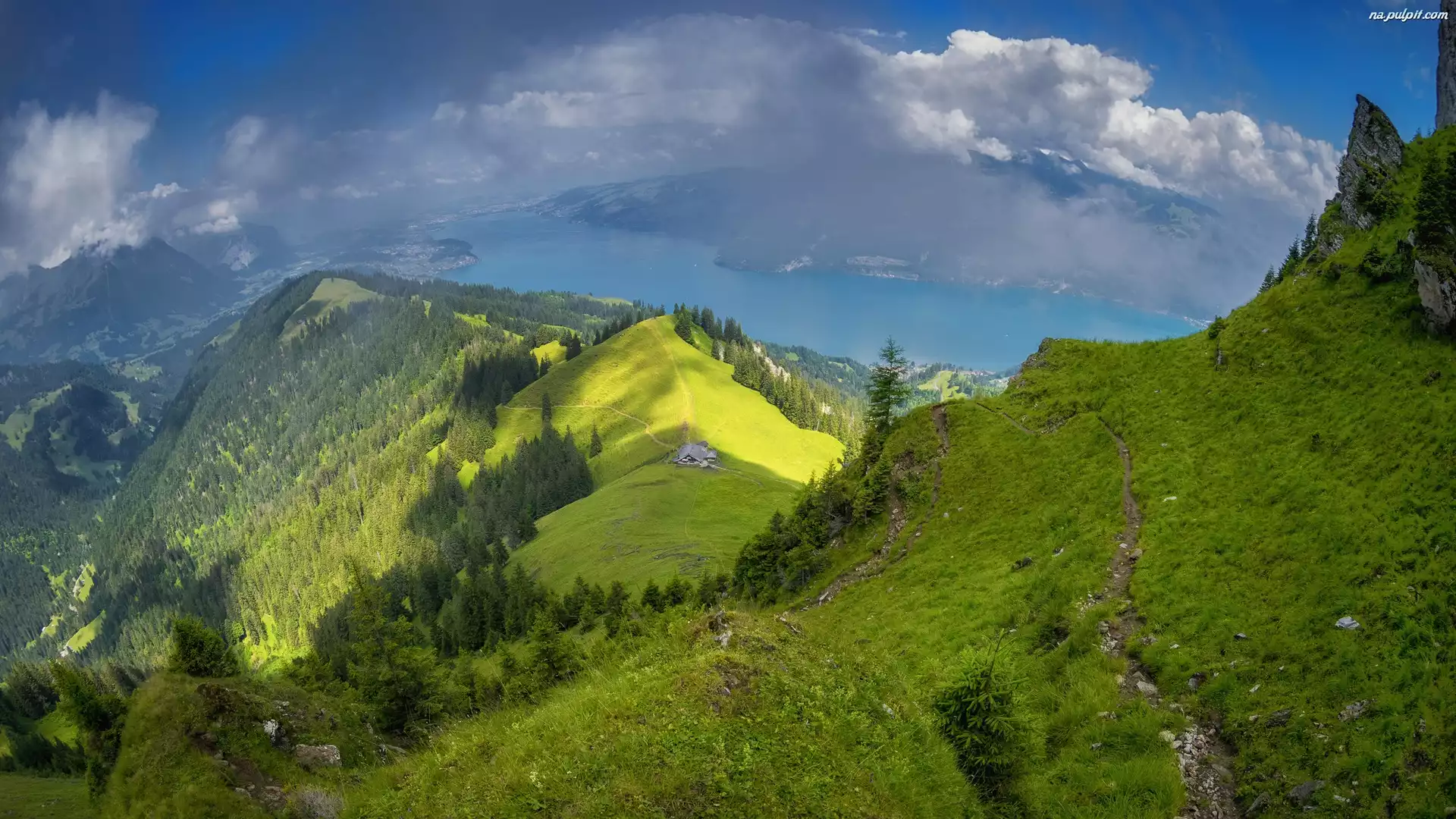 Chmury, Szczyty, Jezioro, Ścieżka, Nasłoneczniony, Stok, Lasy, Góry, Drzewa Na Pulpit