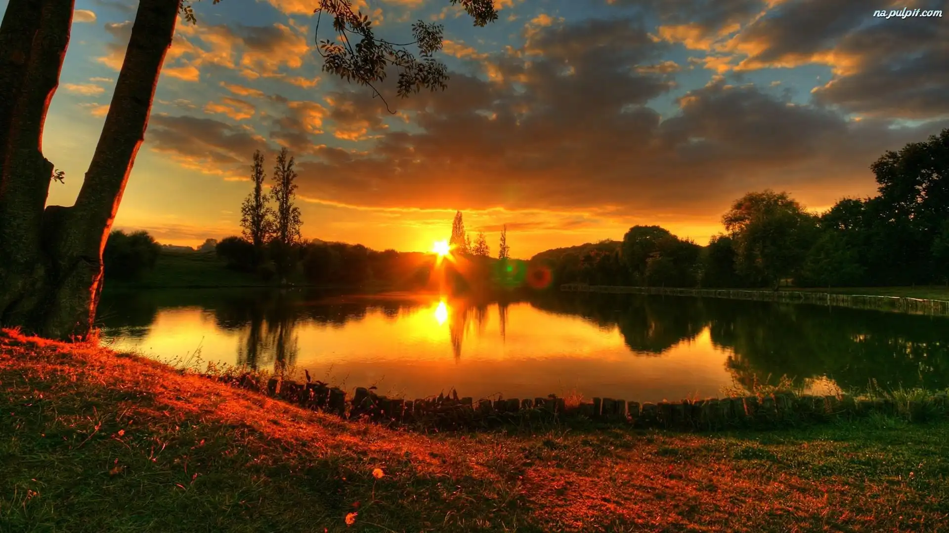 Drzewa, Zachód, Jezioro, Słońca Na Pulpit