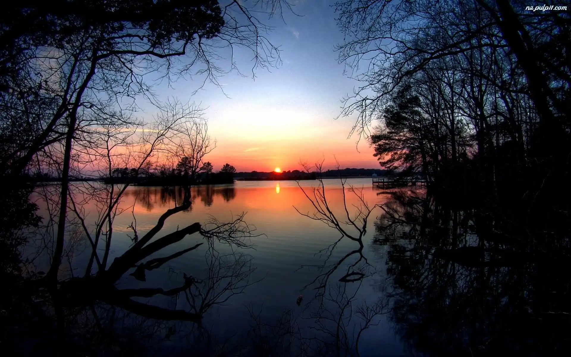 Drzewa, Zachód, Jezioro, Słońca Na Pulpit