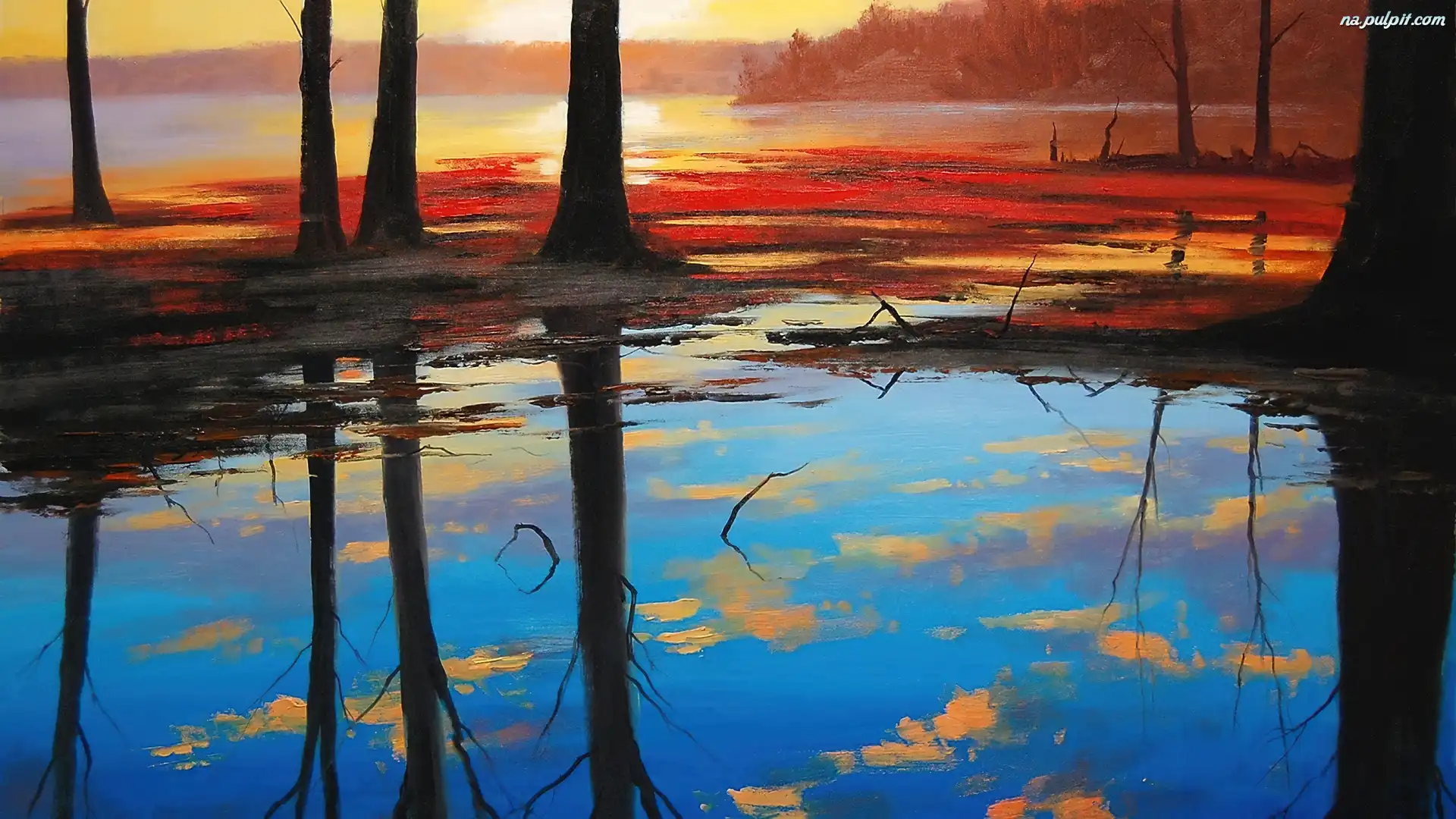 Drzewa, Zachód, Jezioro, Słońca Na Pulpit