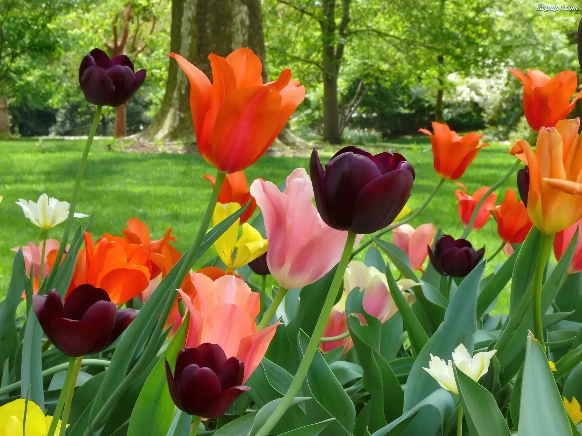 Drzewa, Tulipany, Kolorowe, Trawnik Na Pulpit
