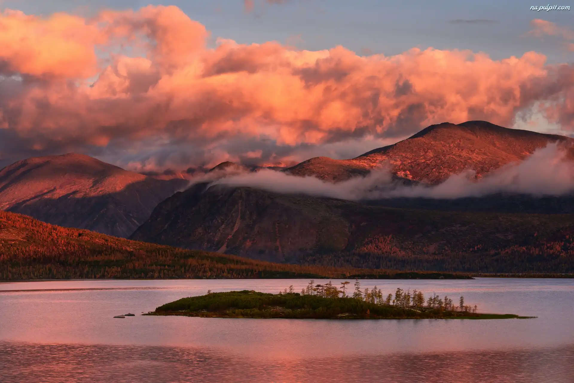 Kołyma, Jezioro Jack London, Drzewa, Chmury, Obwód magadański, Rosja, Mgła, Góry Kołymskie, Zachód słońca Na Pulpit |